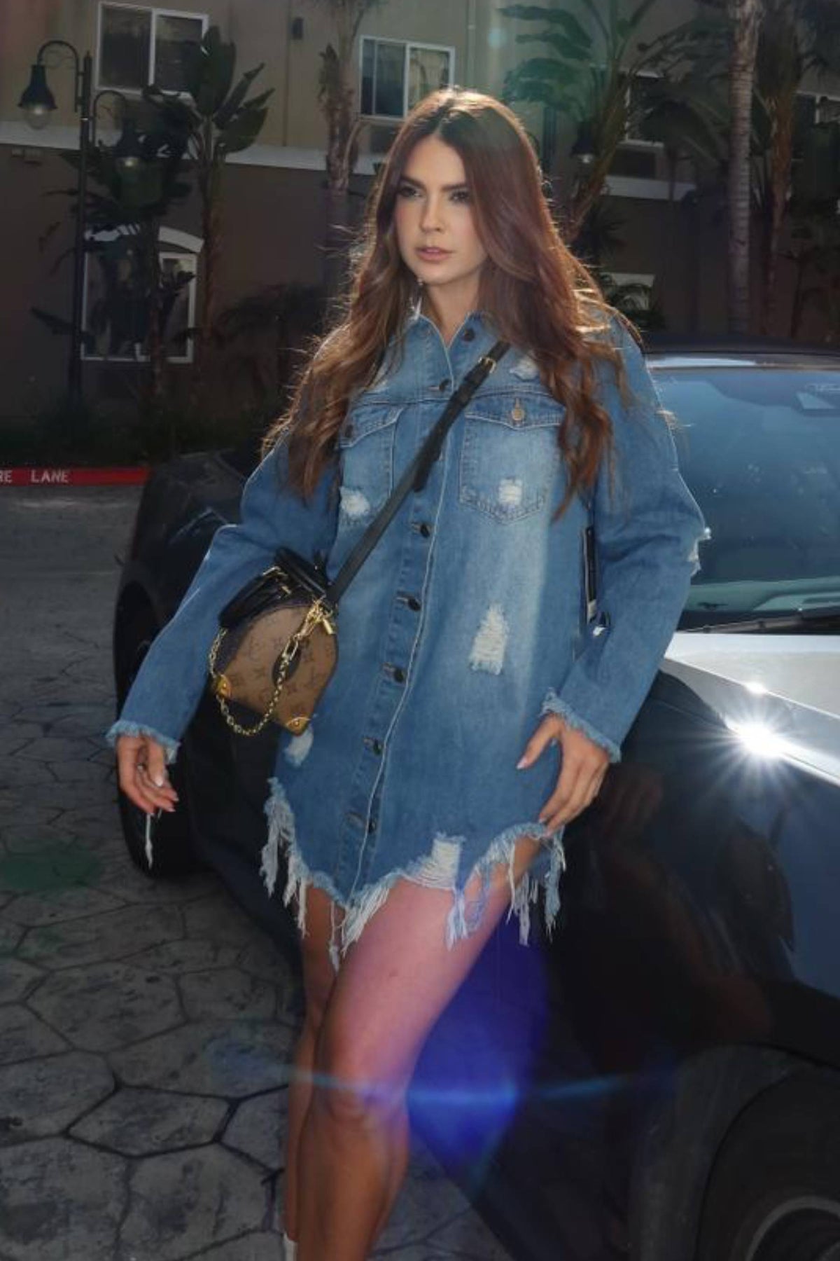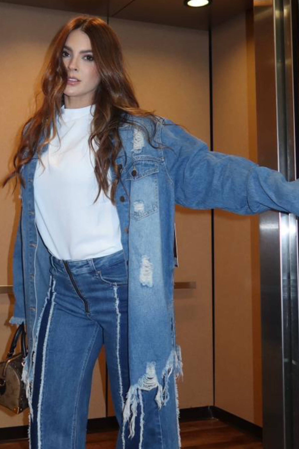 Chaqueta en tela jean larga, con destroyer en parte delantera y trasera