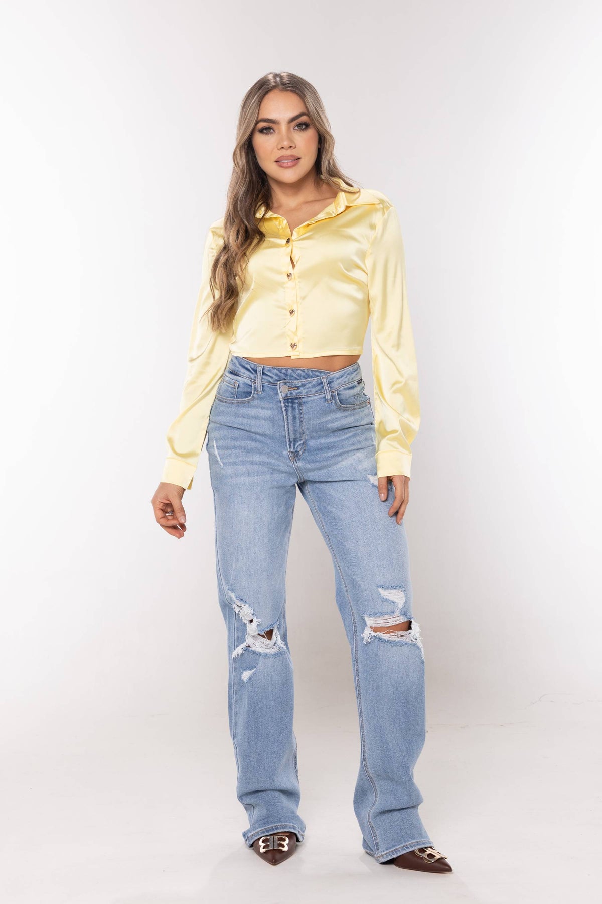 Blusa satinada semirrigida, manga larga, con botones en forma de corazon, cuello doblado tipo camisero, espalda descubierta y tiras para ajustar el ancho.