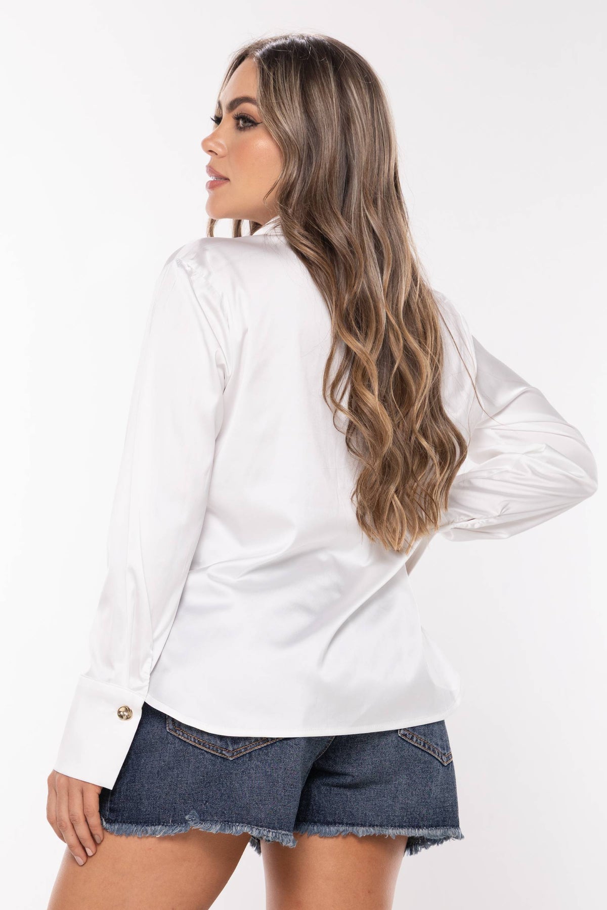 Blusa manga larga satinada semirrigida, con cuello doblado y botones en formas elegantes.
