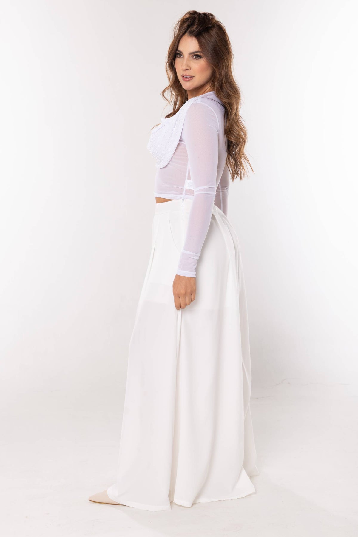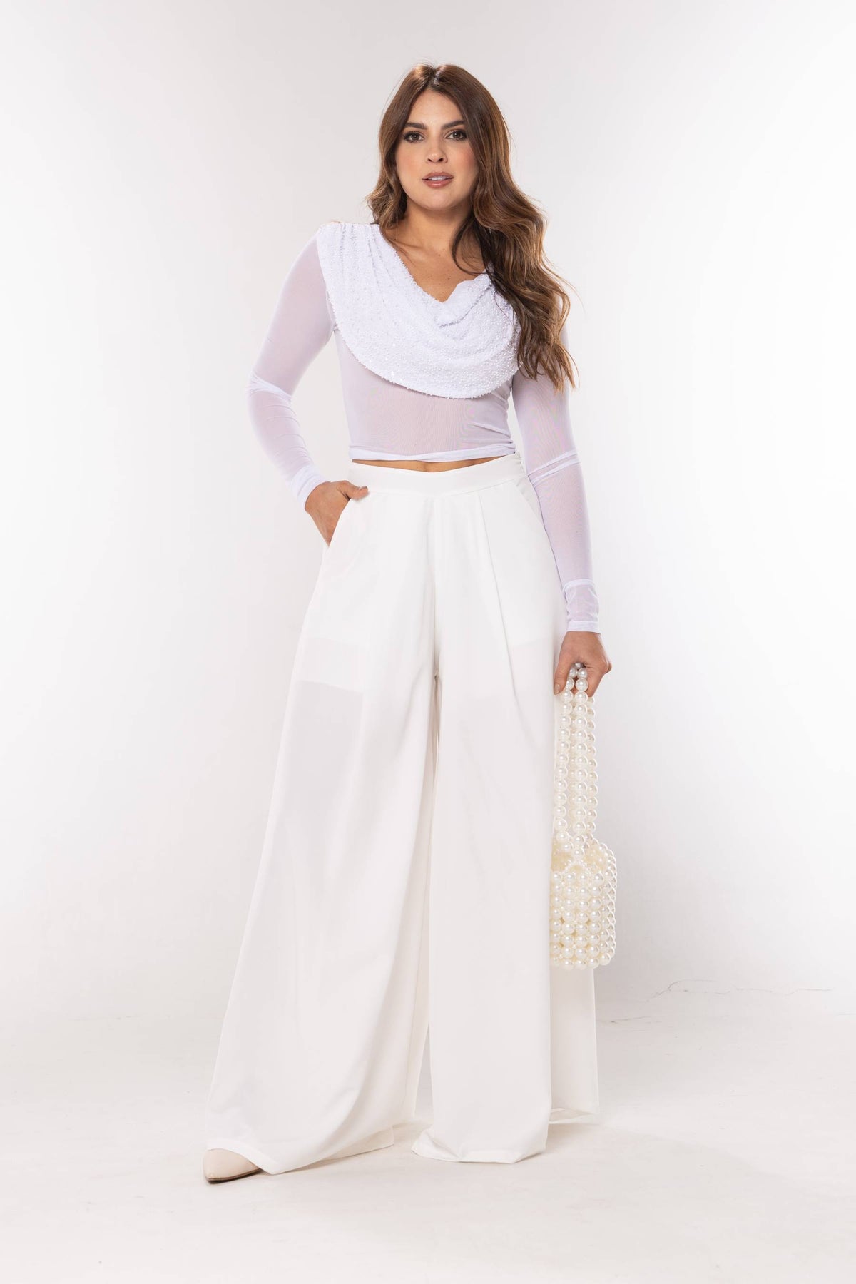 Croptop manga larga con cuello drapeado y chaquiras, en tela mallatex.