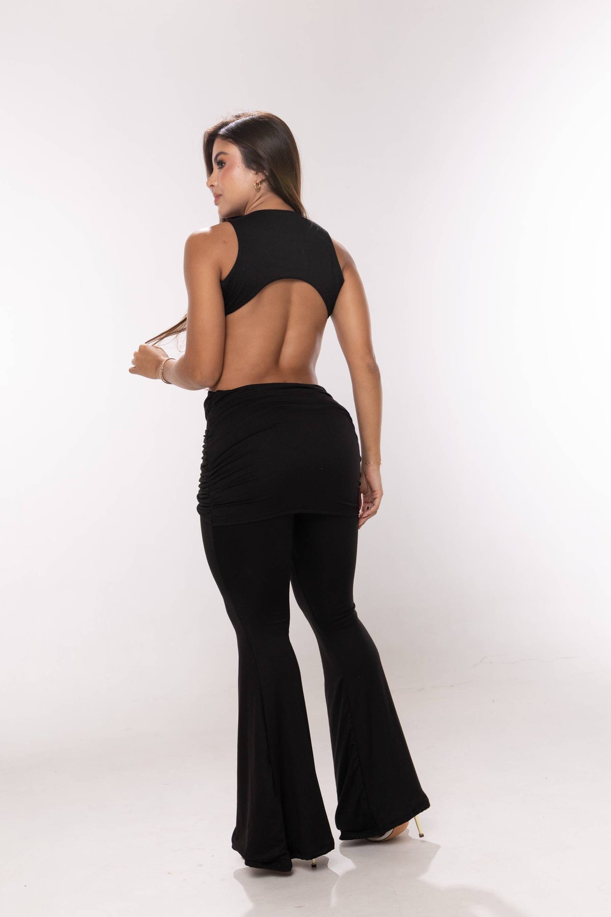 Enterizo largo en tela licrada, diseño con tela recogida en cadera efecto falda, blusa con nudo y escote triangular y espalda descubierta.