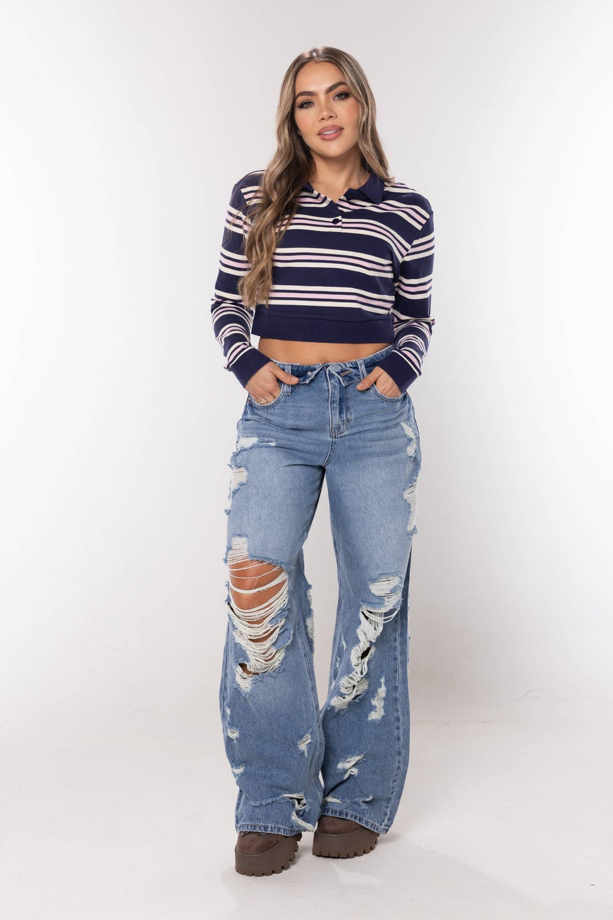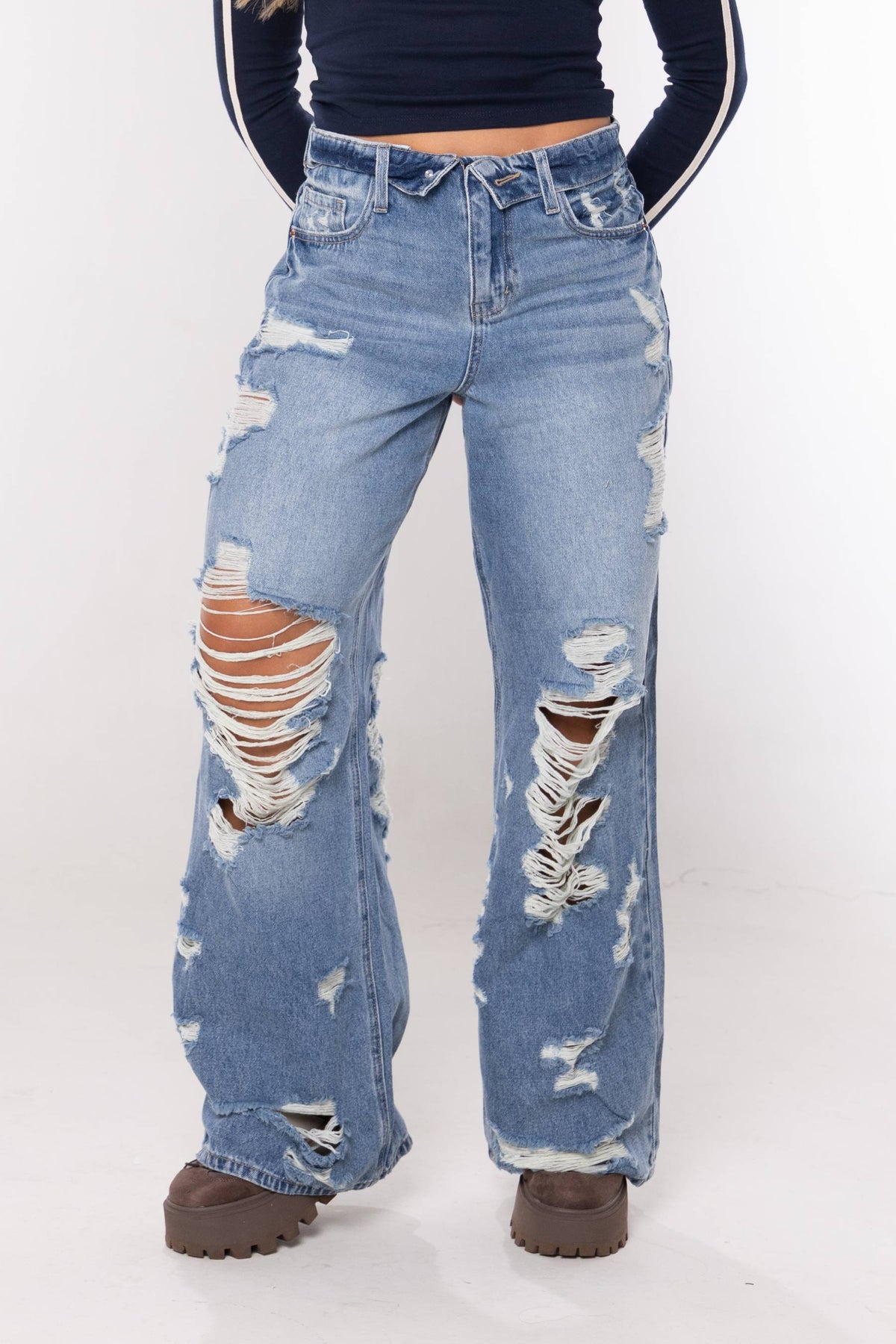 Jean denim de bota recta, con destroyer frontal y trasero, bolsillos laterales y posteriores, y pretina doblada de efecto suelto.