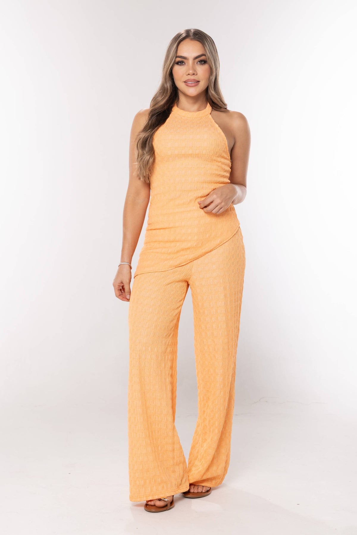 Set pantalon acanalado en tela licra, blusa asimetrica de cuello halter, pantalon clasico de corte amplio y recto.