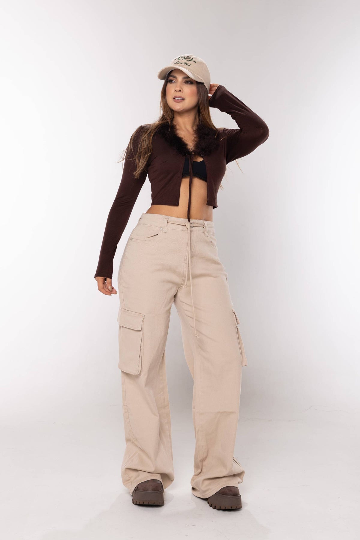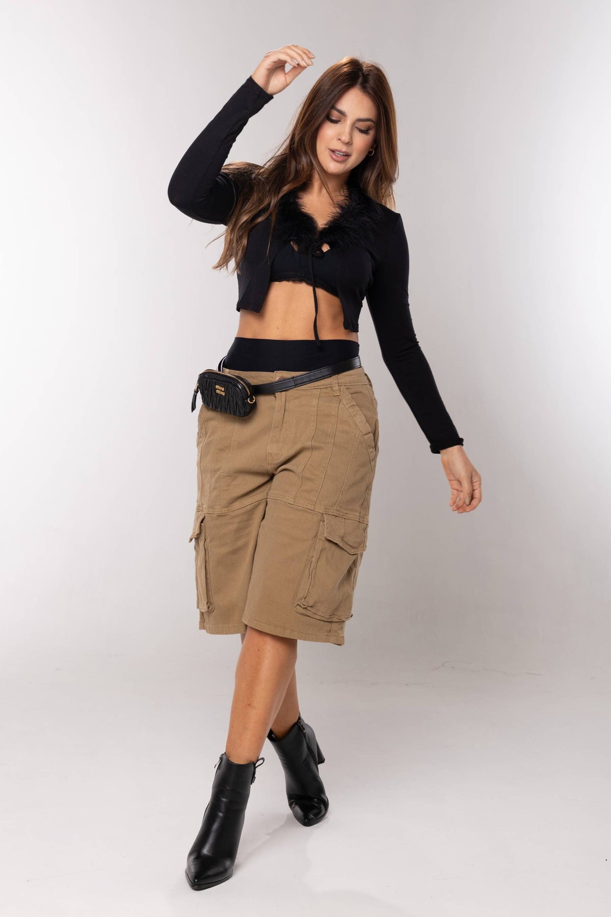 Croptop manga larga en tela elastica, diseño abierto con tiras para amarrar y detalle de plumas en el cuello.
