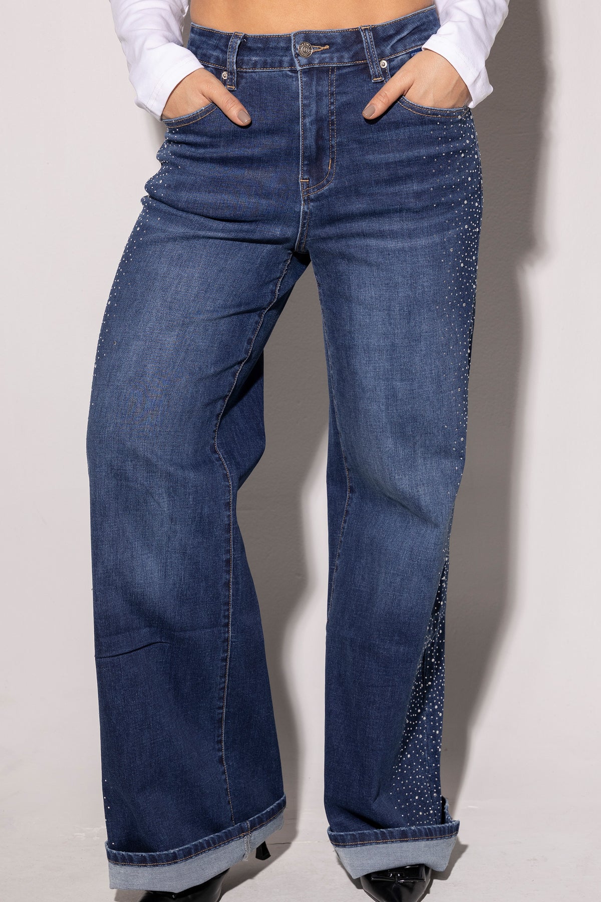 Jean en bota recta con piedras brillantes en los laterales y bolsillos funcionales en parte delantera y trasera