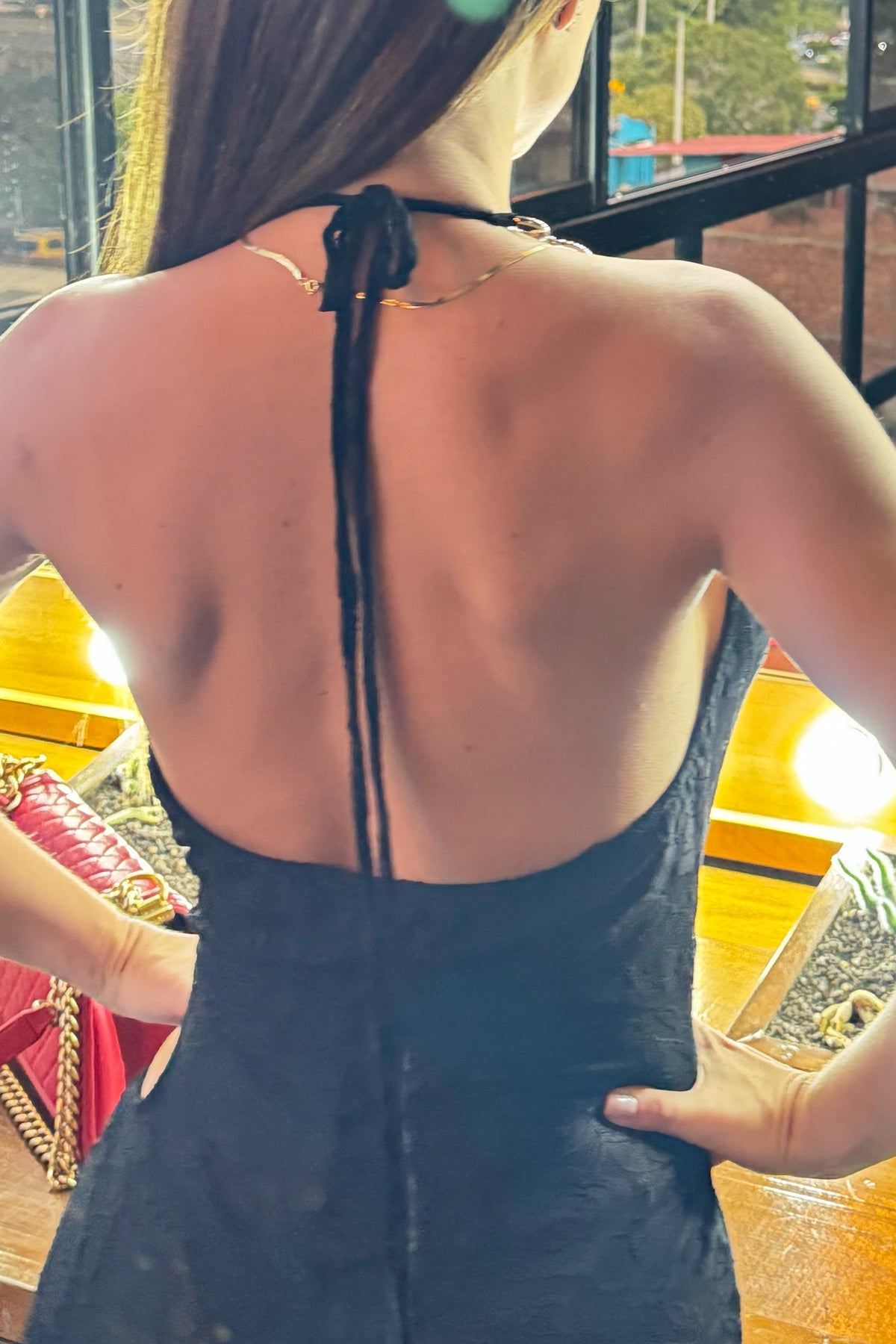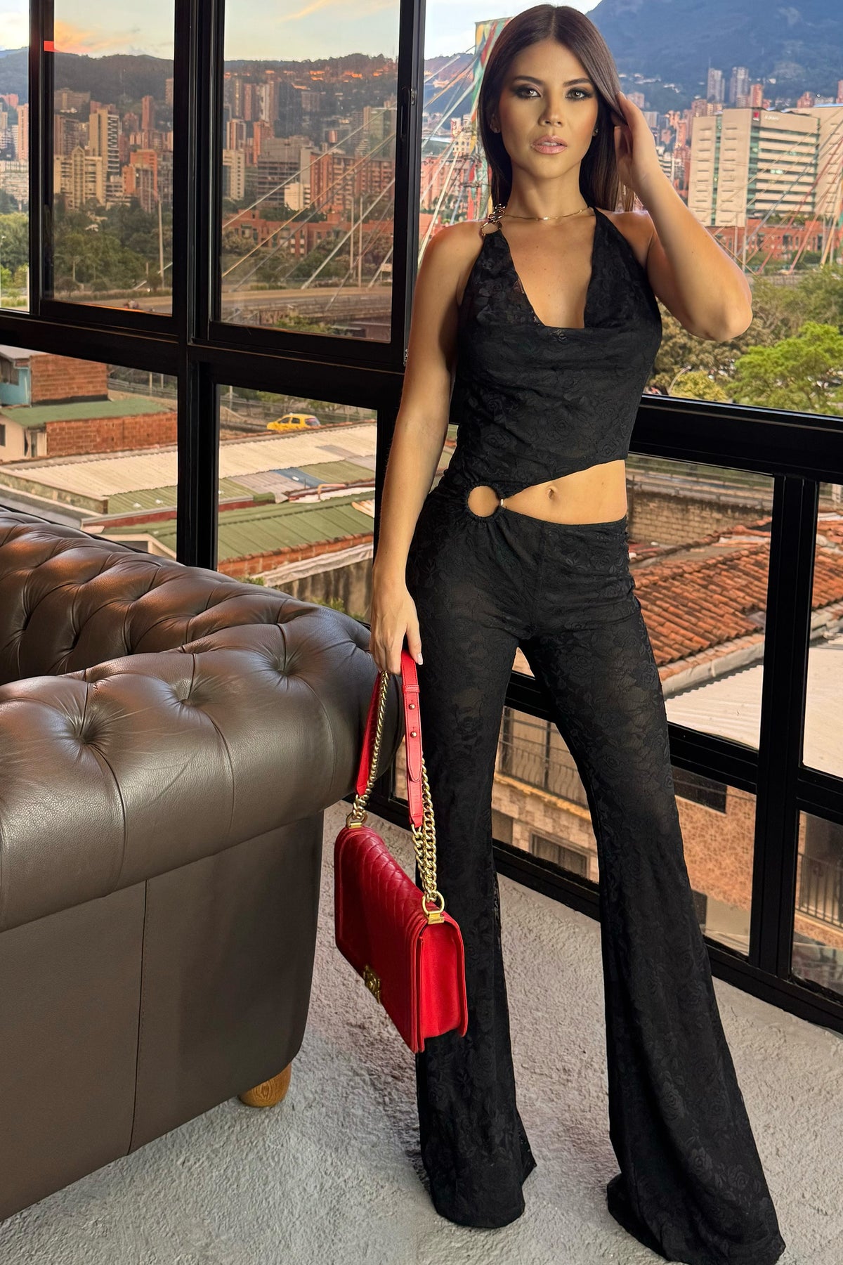 Enterizo en blonda con cuello vaceado y escote a un costado y argolla en abdomen