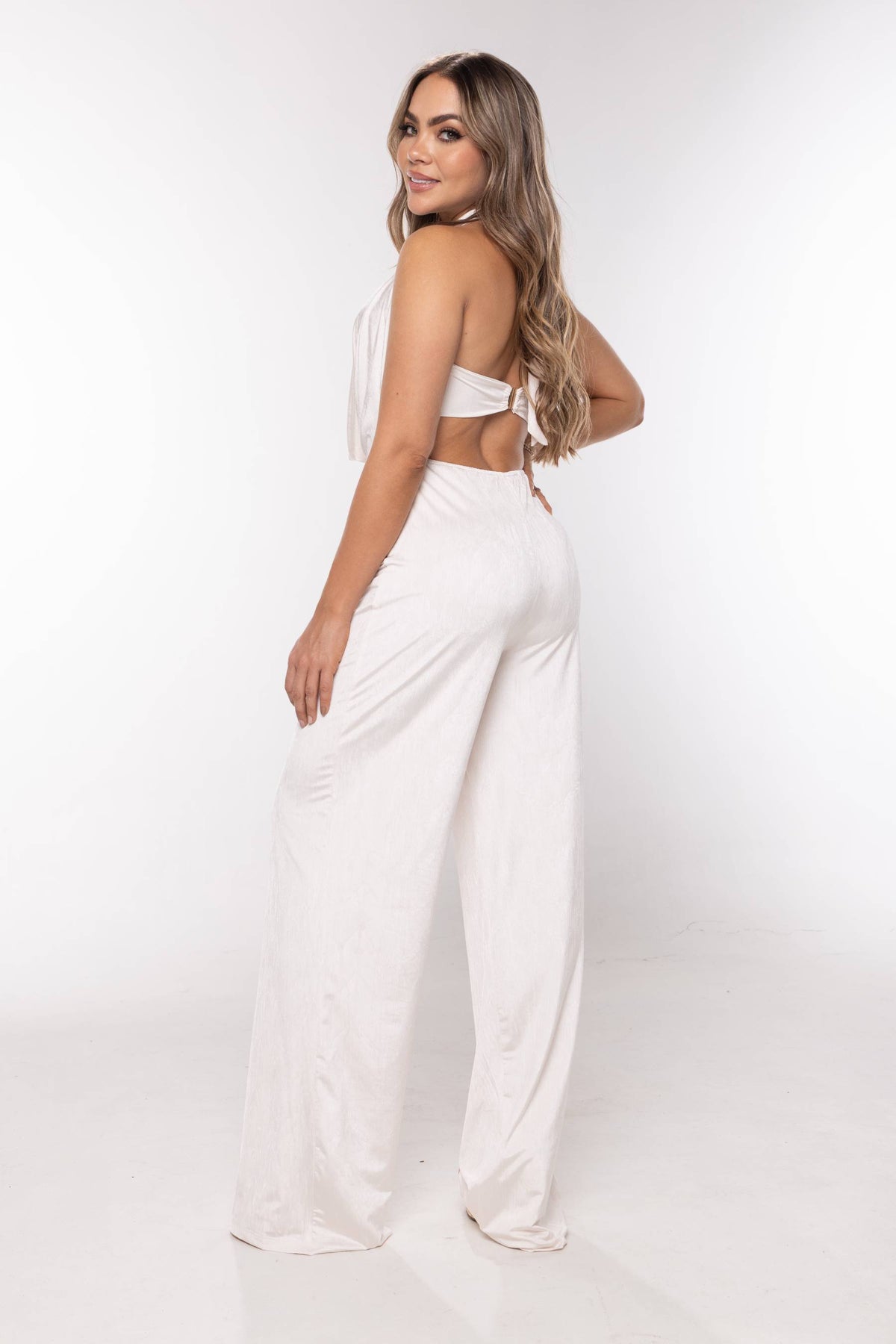 Enterizo de pantalon en tela amplia y licrada, bota recta, espalda descubierta y cuello drapeado con croptop interno y aro dorado central.