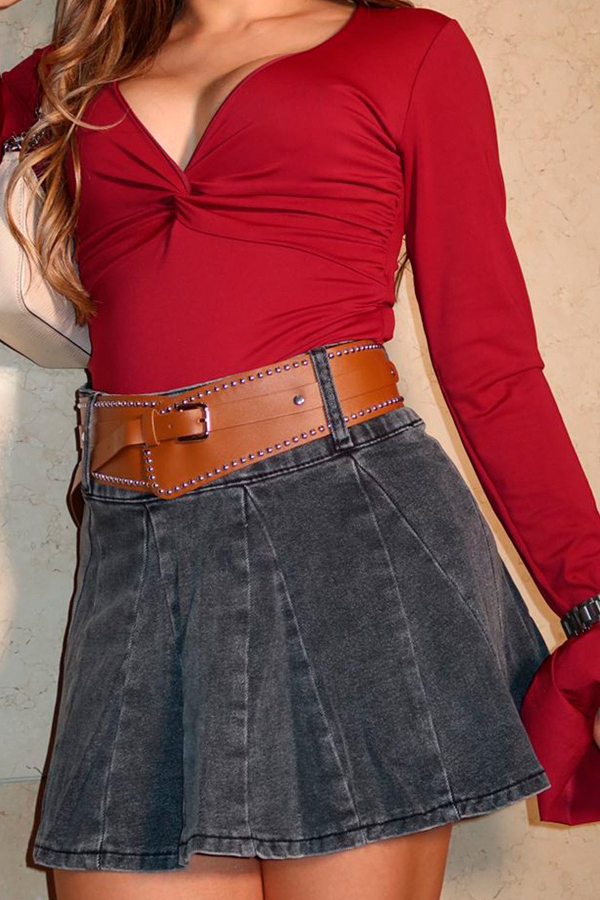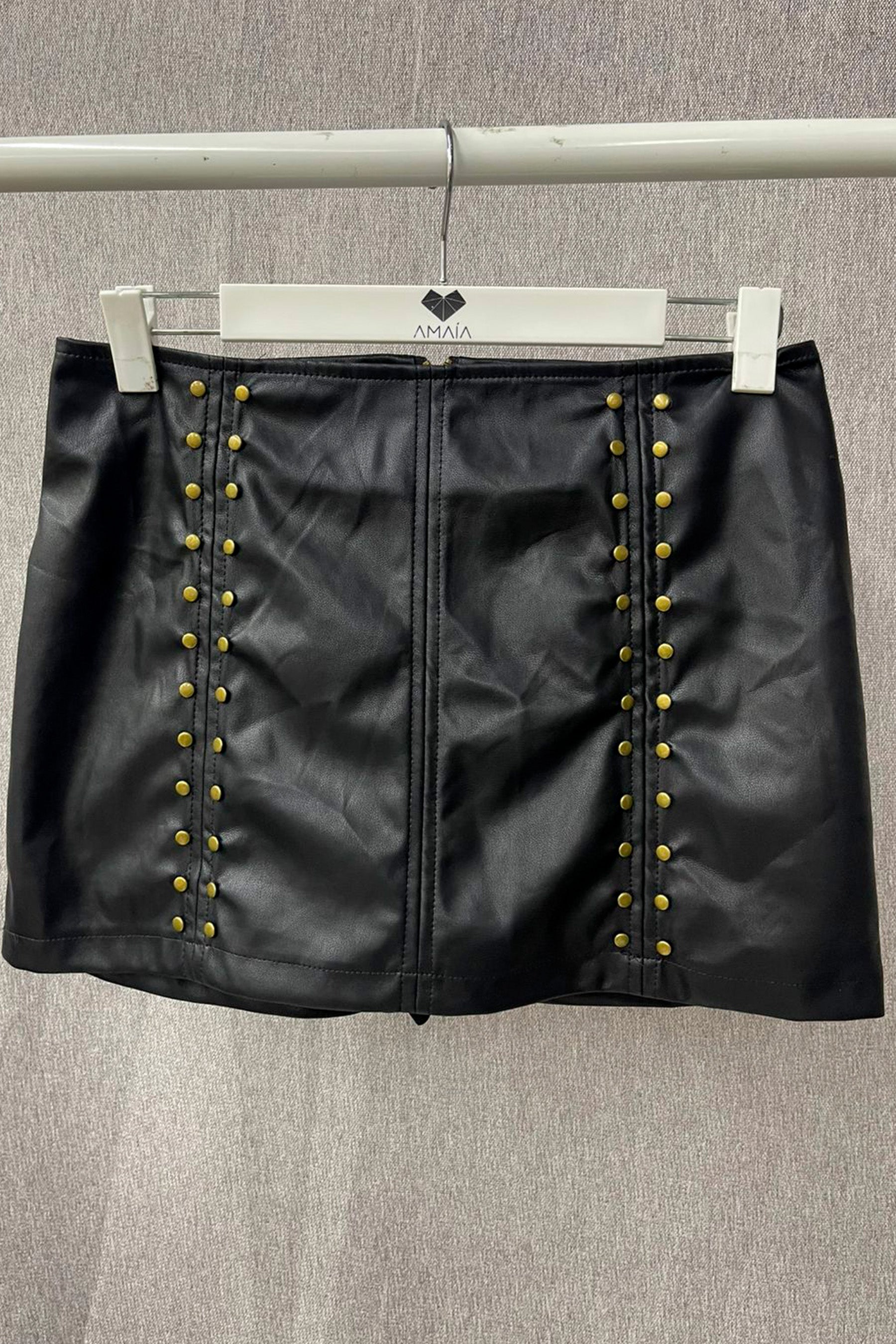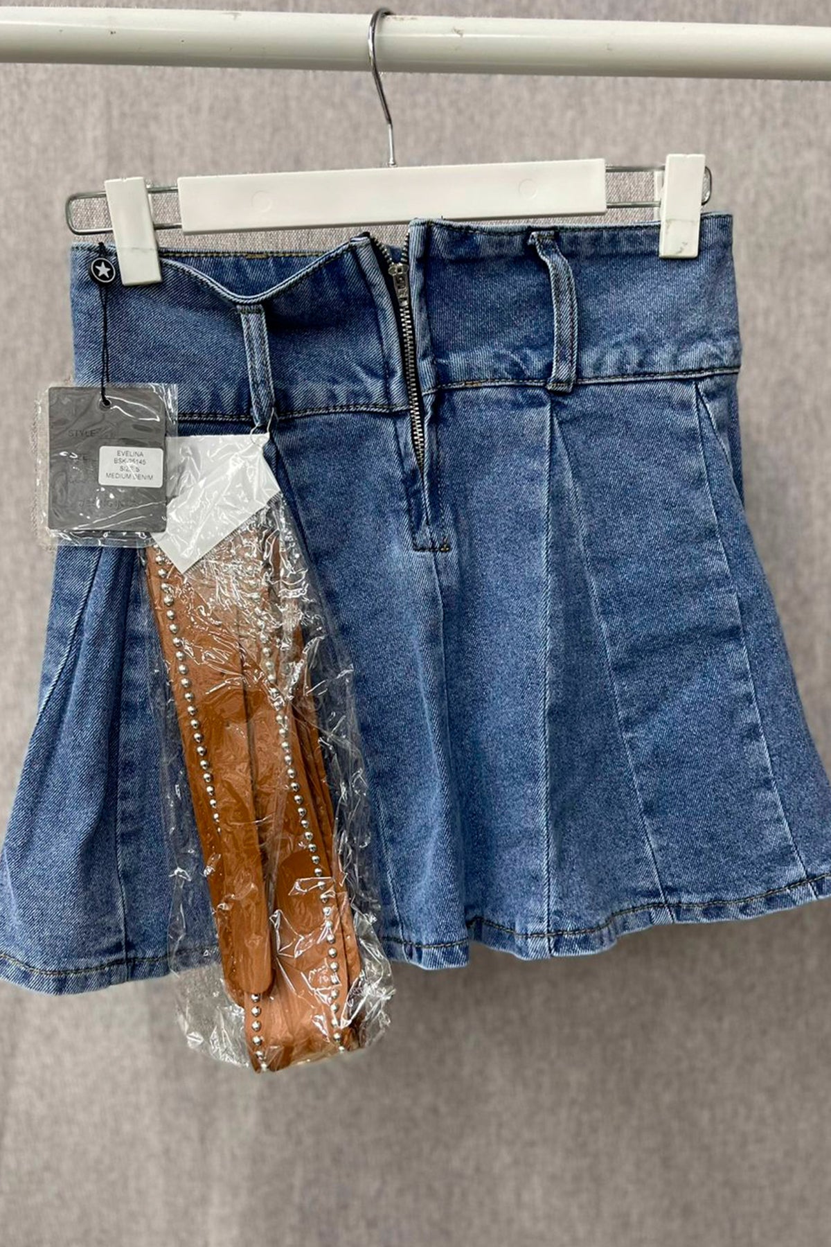 Falda en jeans con tablas con cierre y boton en la parte delantera