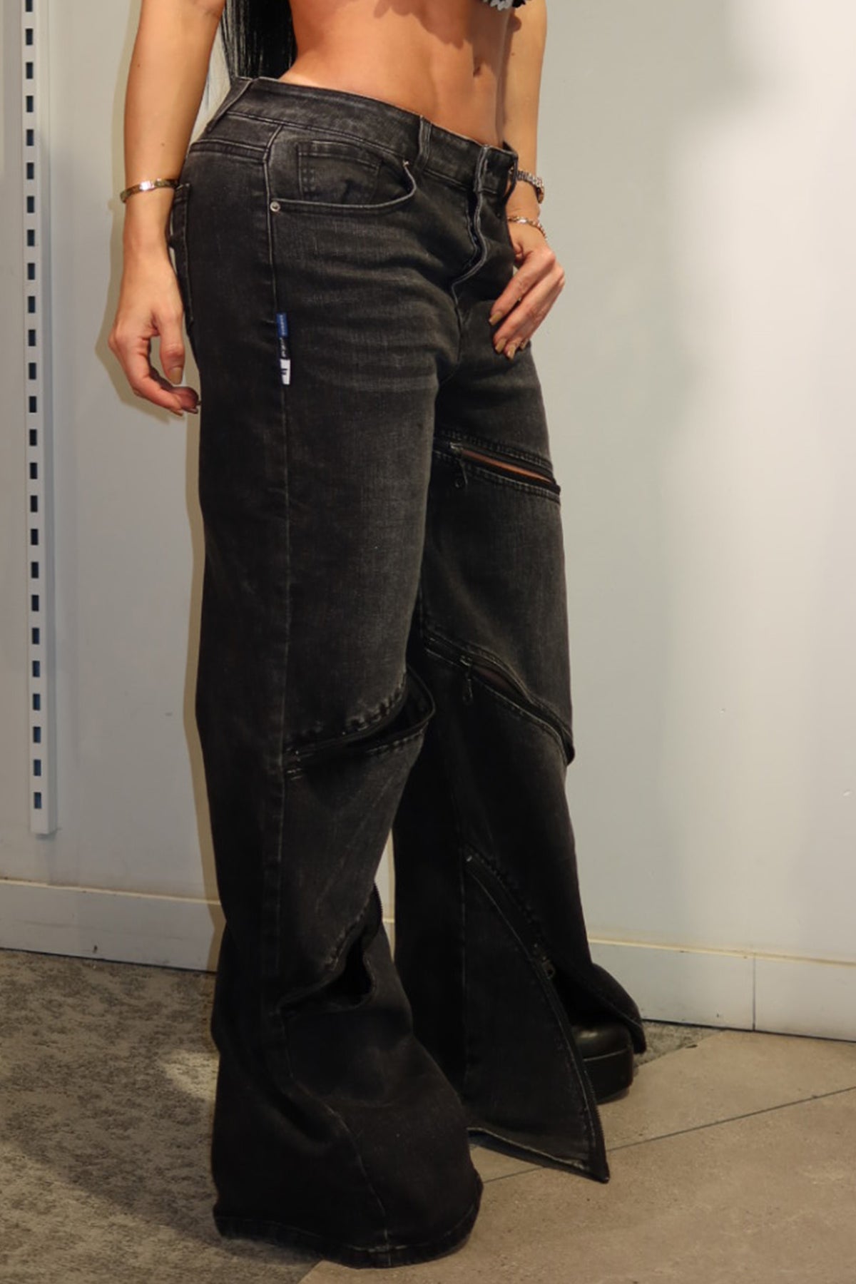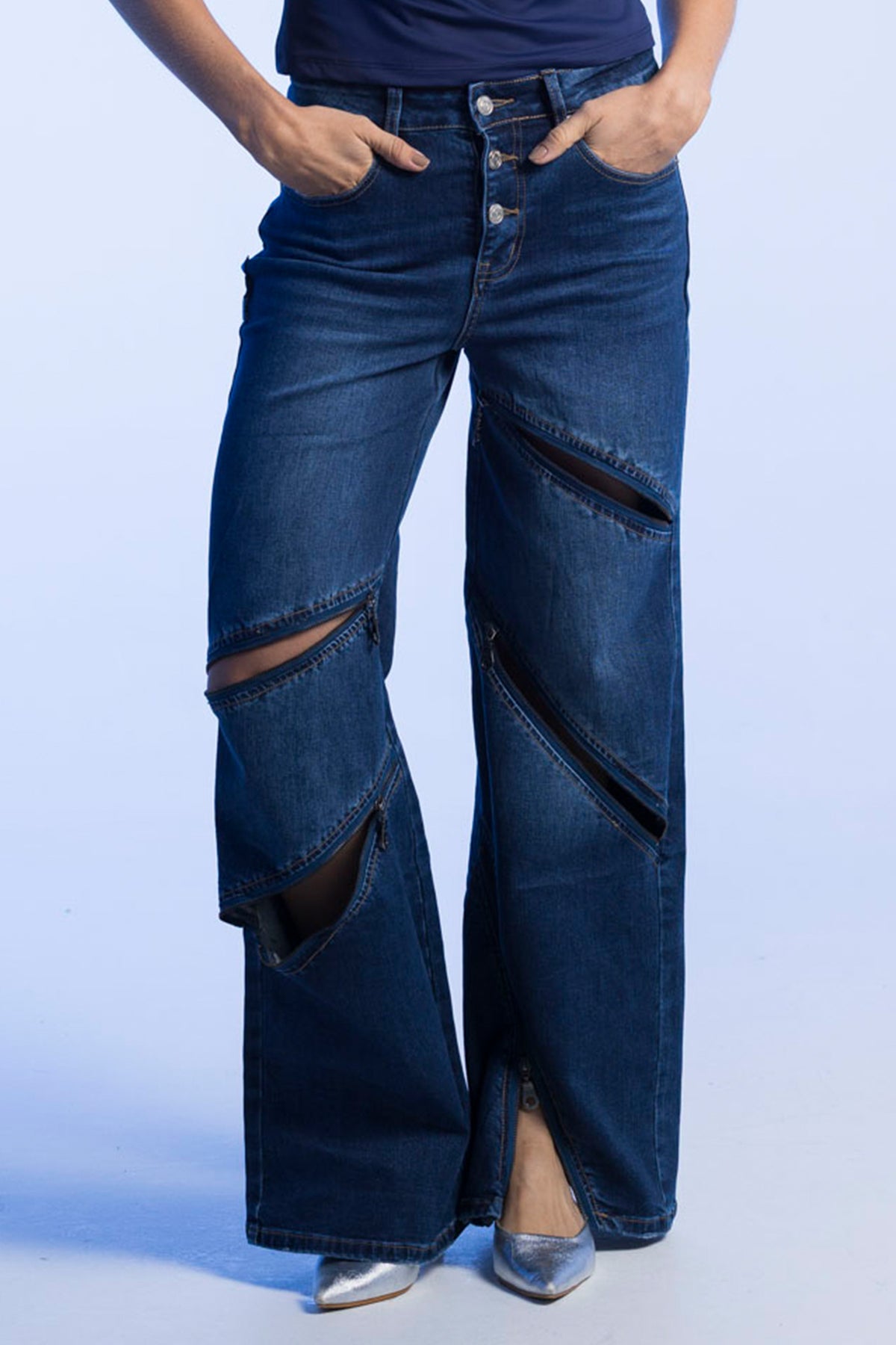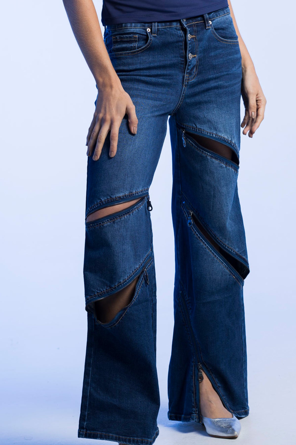 Jean con cierres diagonales en la parte frontal y bolsillos funcionales