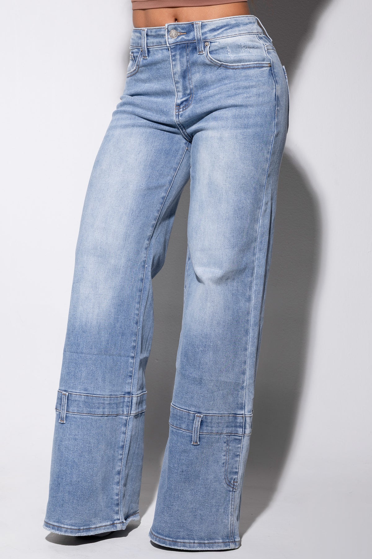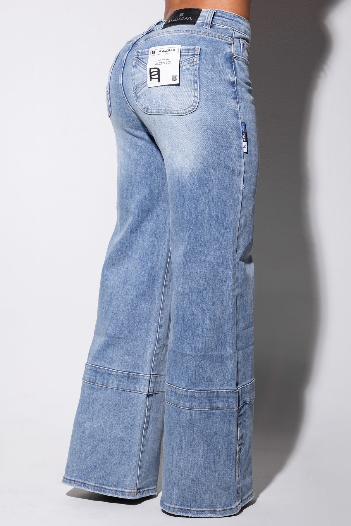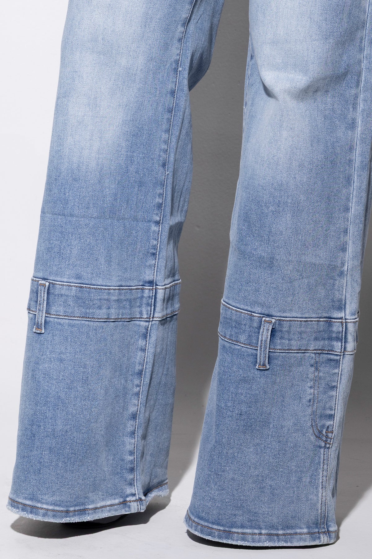 Jean bota amplia con costura en la parte inferior y bolsillos funcionales en la parte delantera y trasera