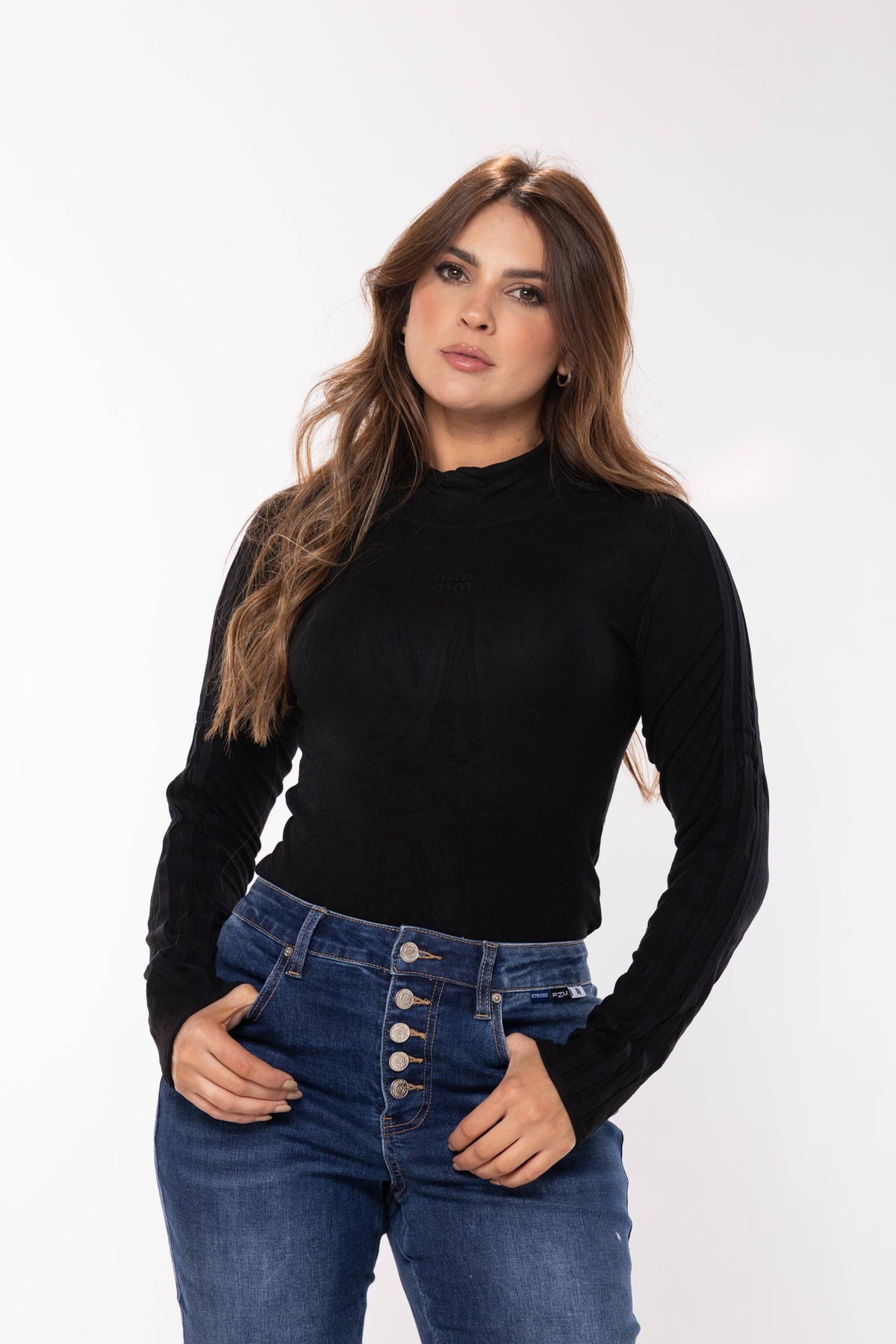 Camisbuso con rayas laterales y cuello alto con letras sublimadas en la parte delantera
