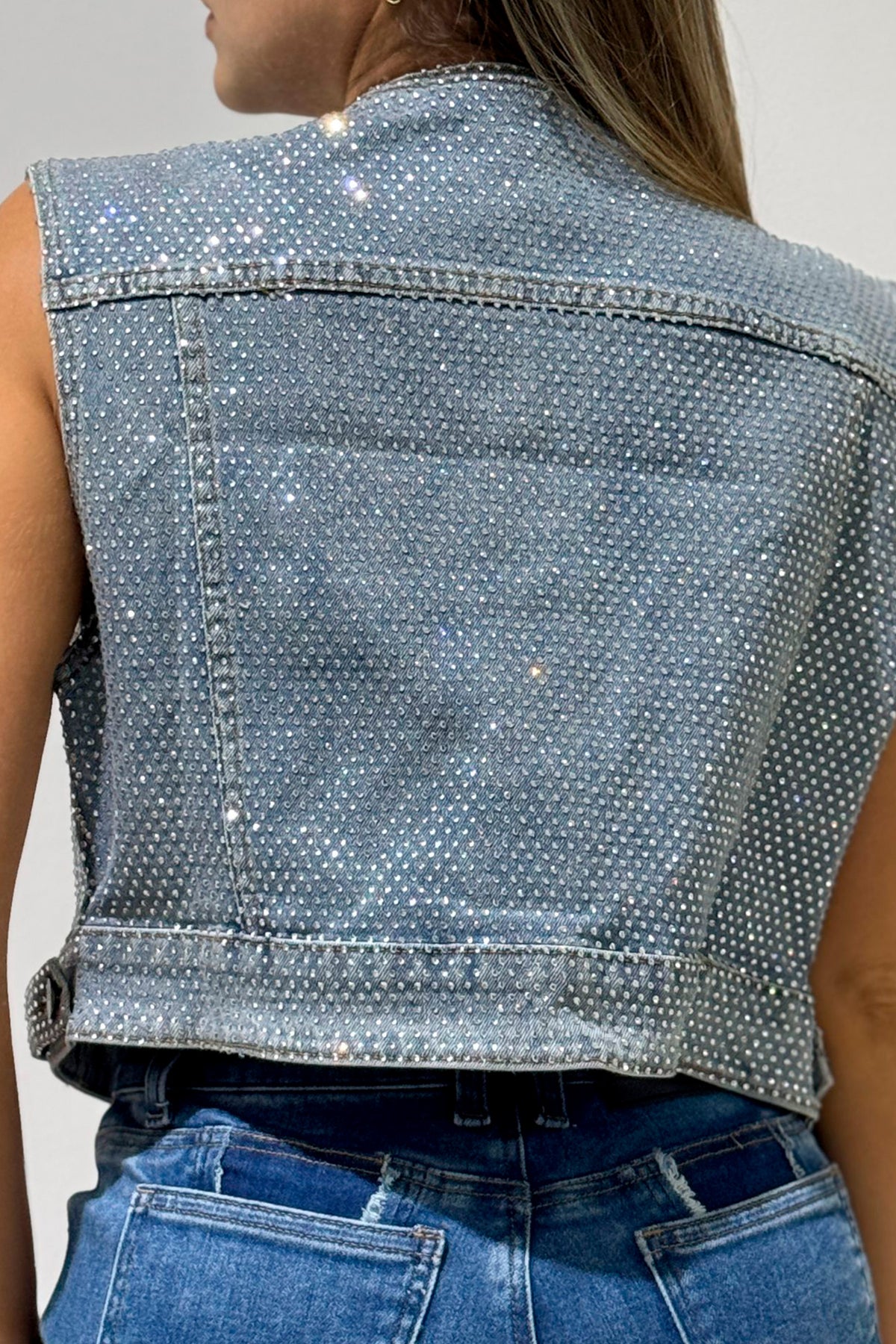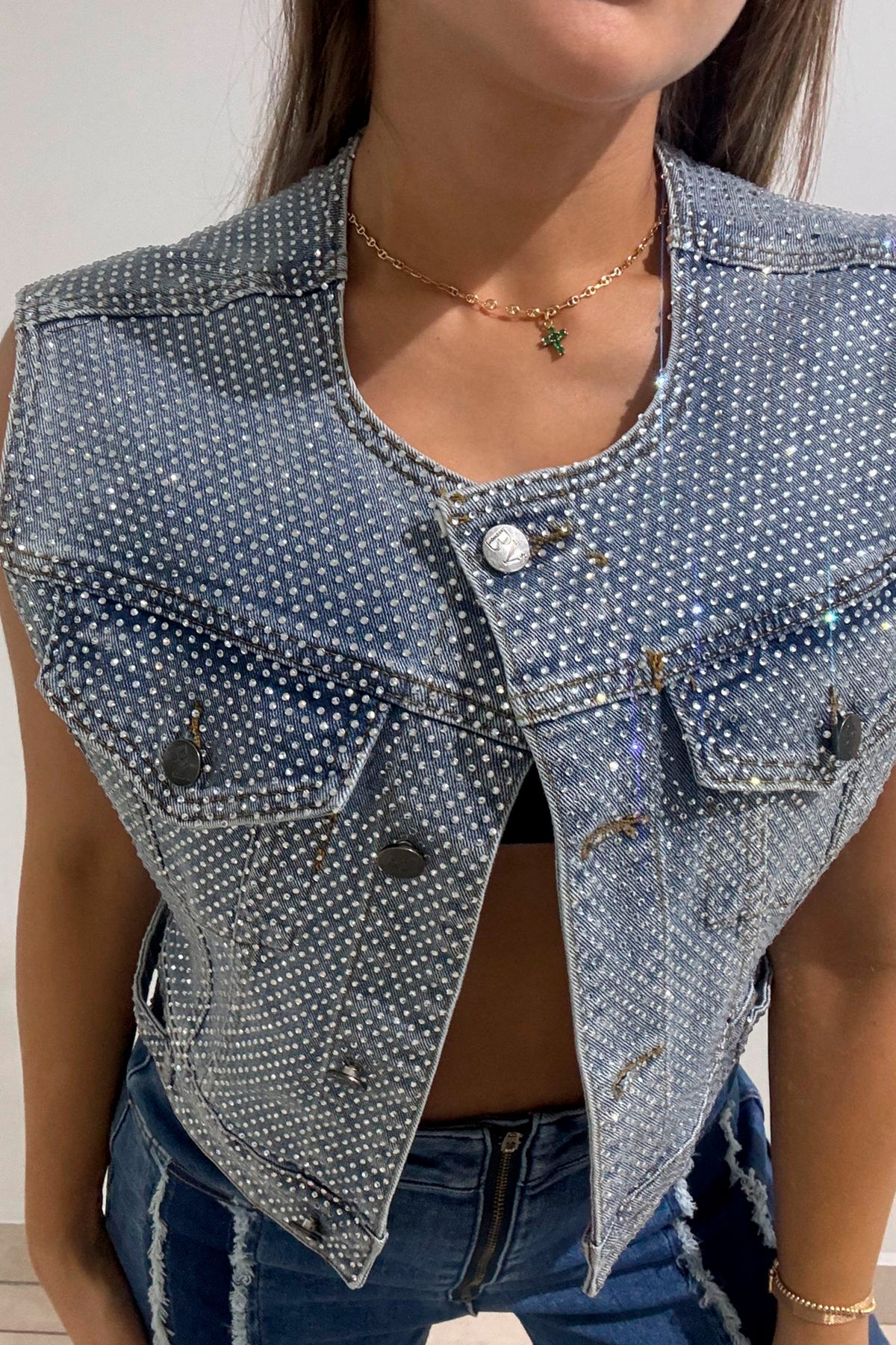 Chaleco en manga siza con pequeñas piedras brillantes en toda la prenda y costuras en otro tono con bolsillos en la parte delantera