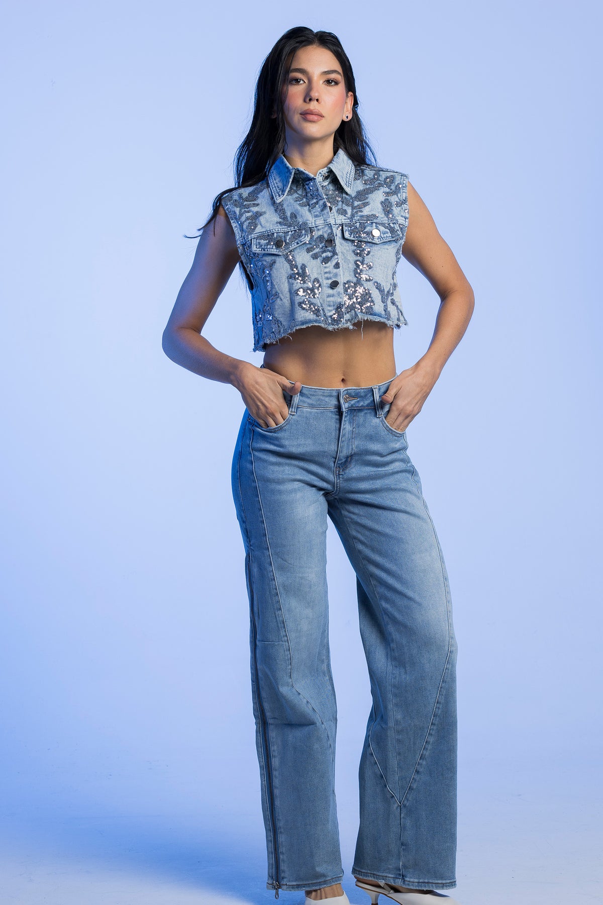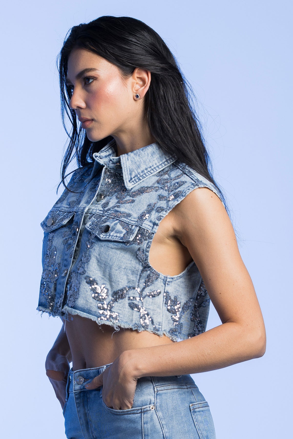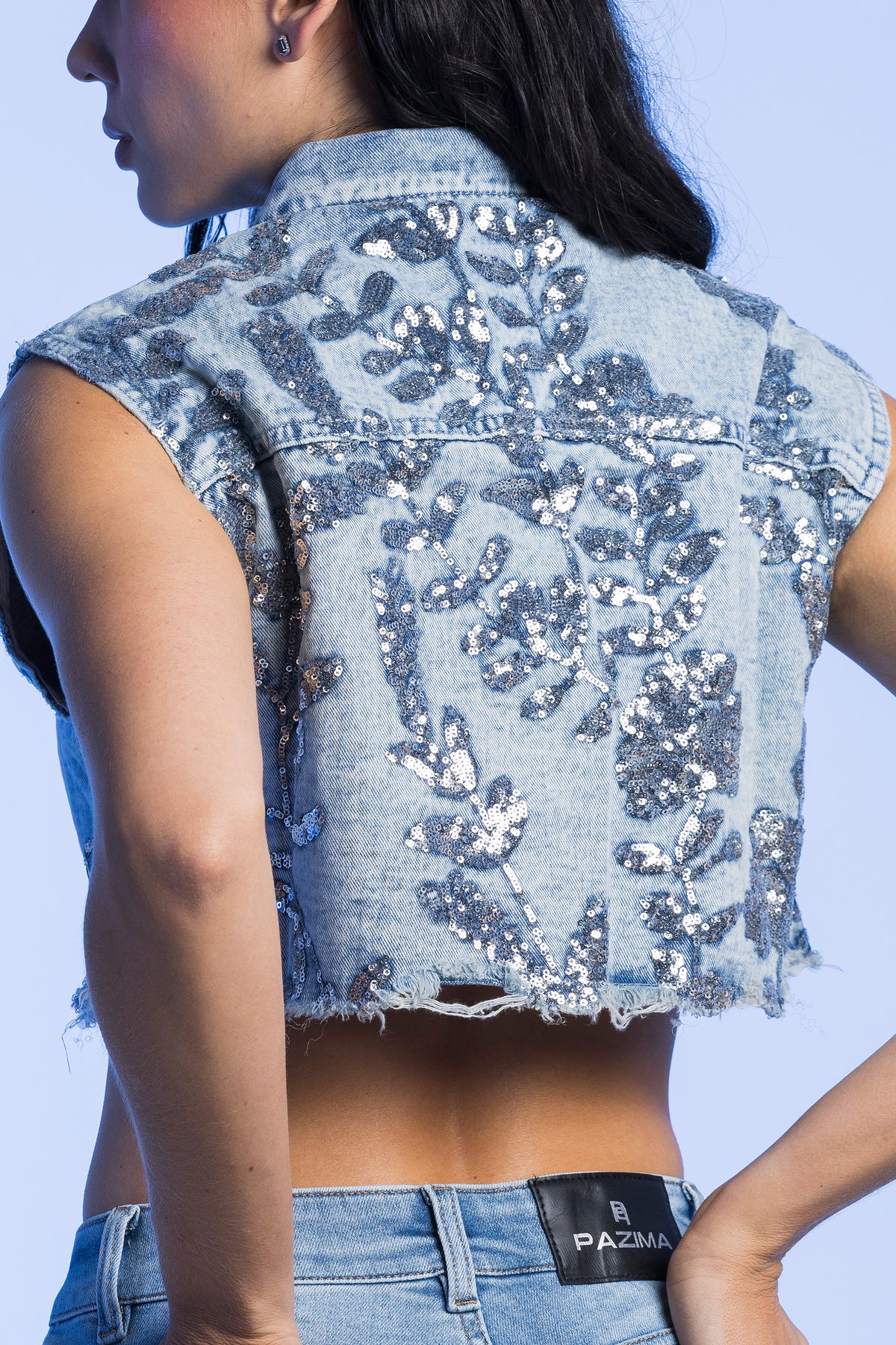 Chaleco en denim con flores en lentejuelas en la parte delantera