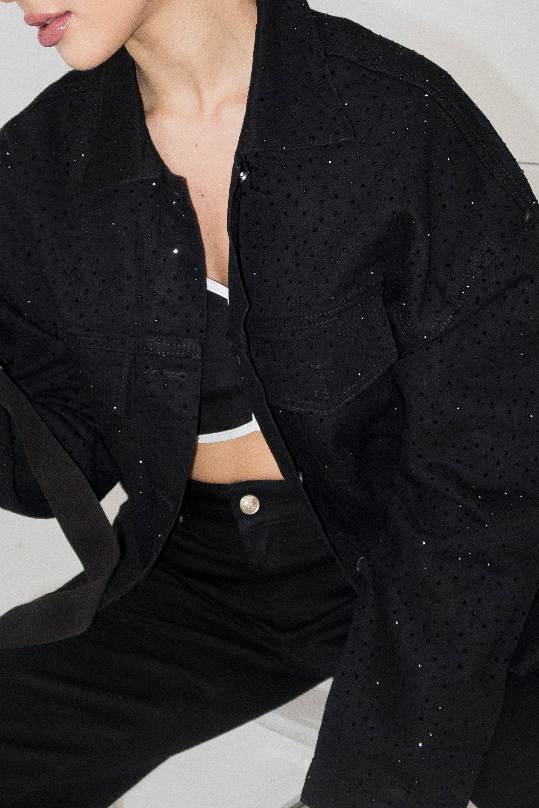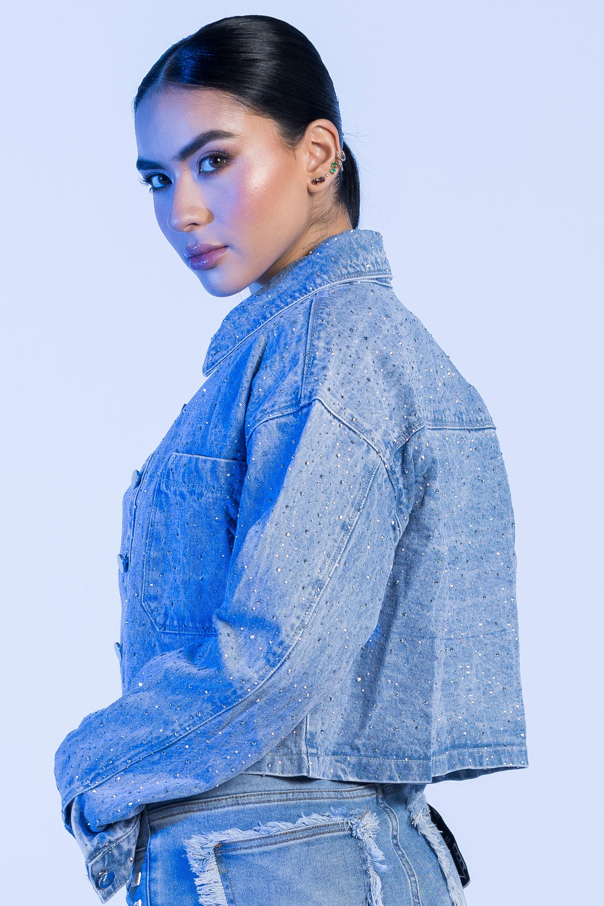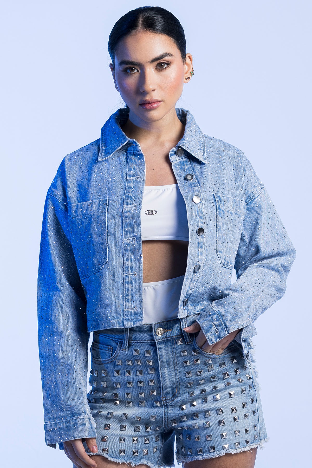 Chaqueta de piedras brillantes en denim con bolisllos delanteros