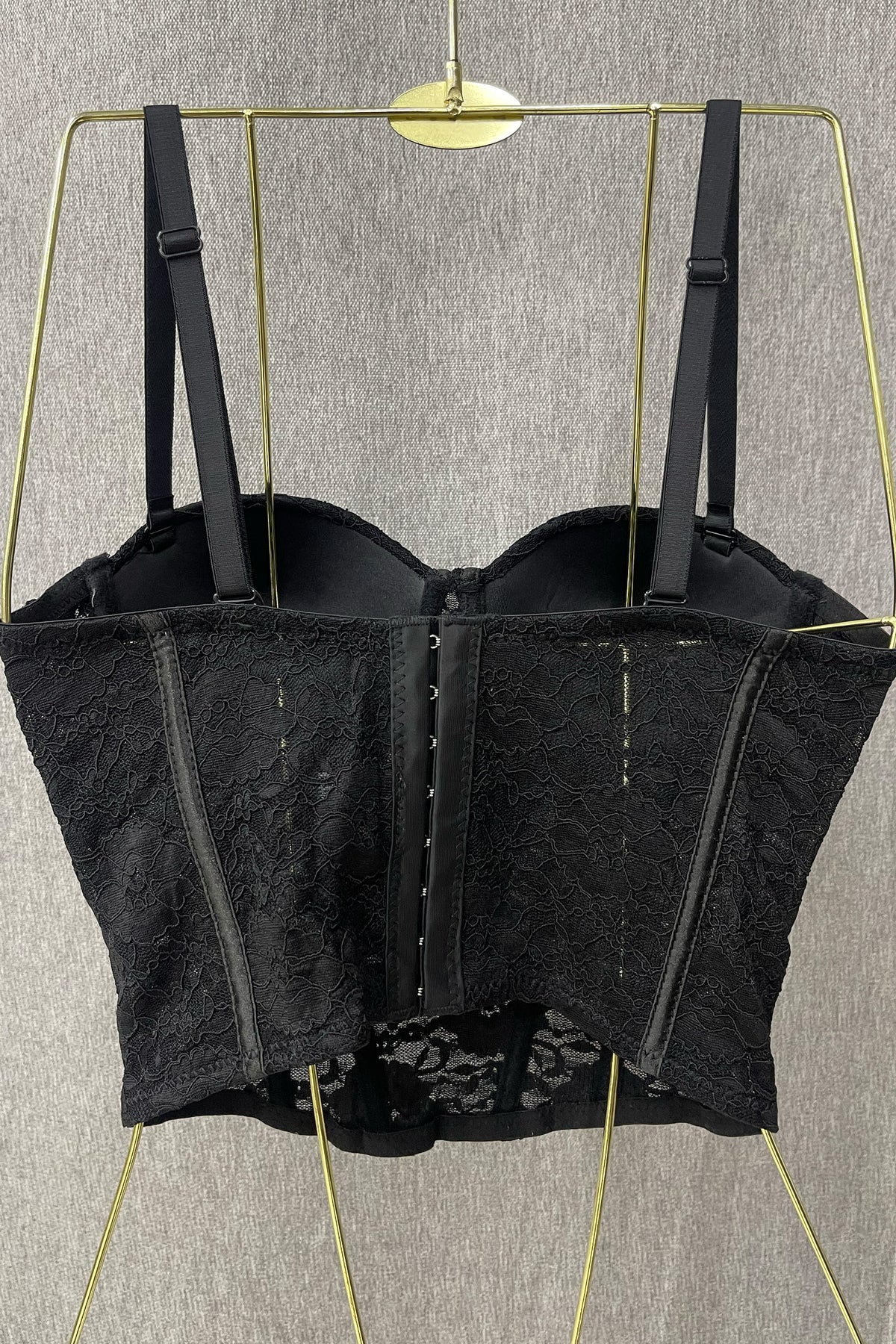 Croptop en blonda con copa con pre horma y tiras ajustables en hombros, con varillas en abdomen