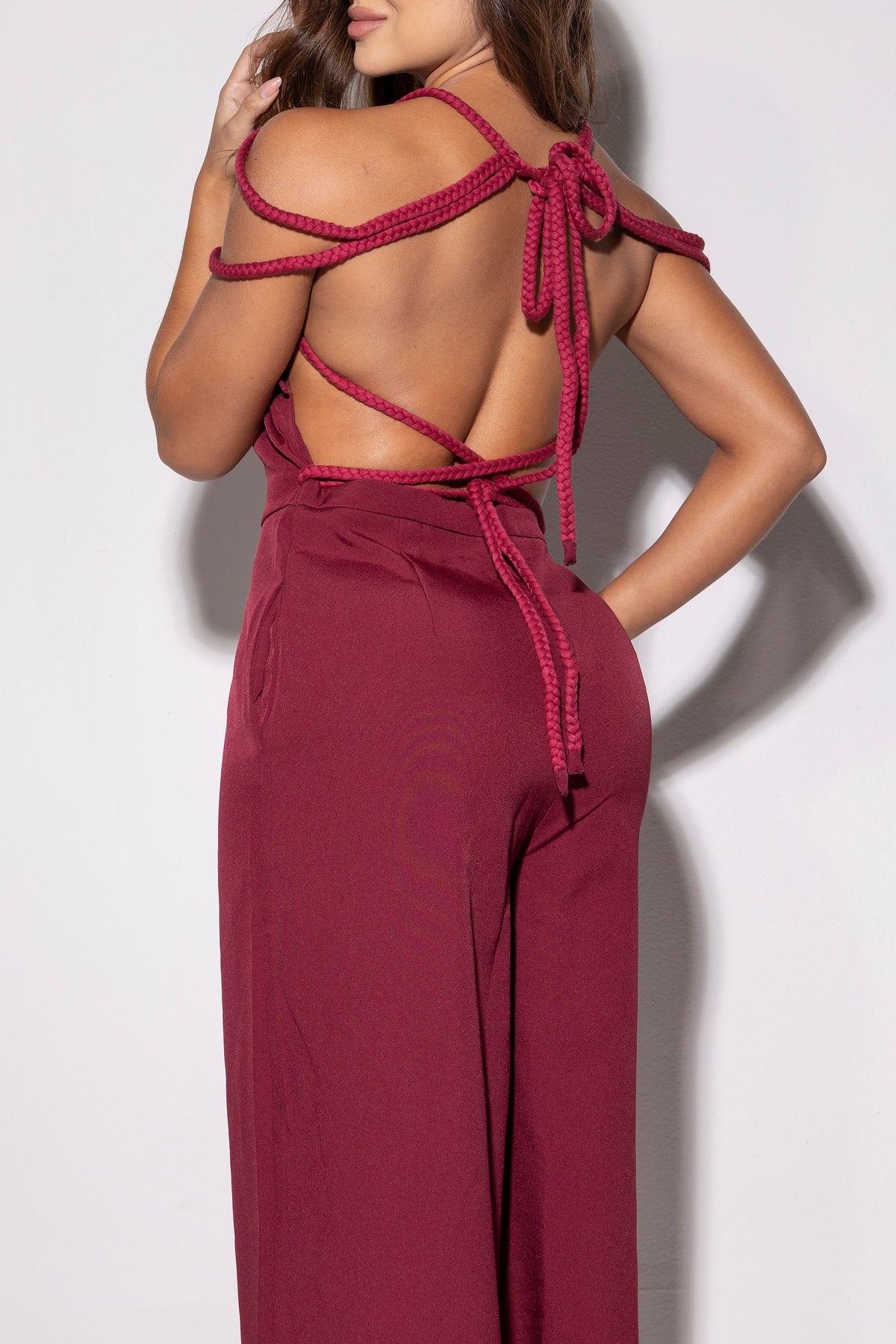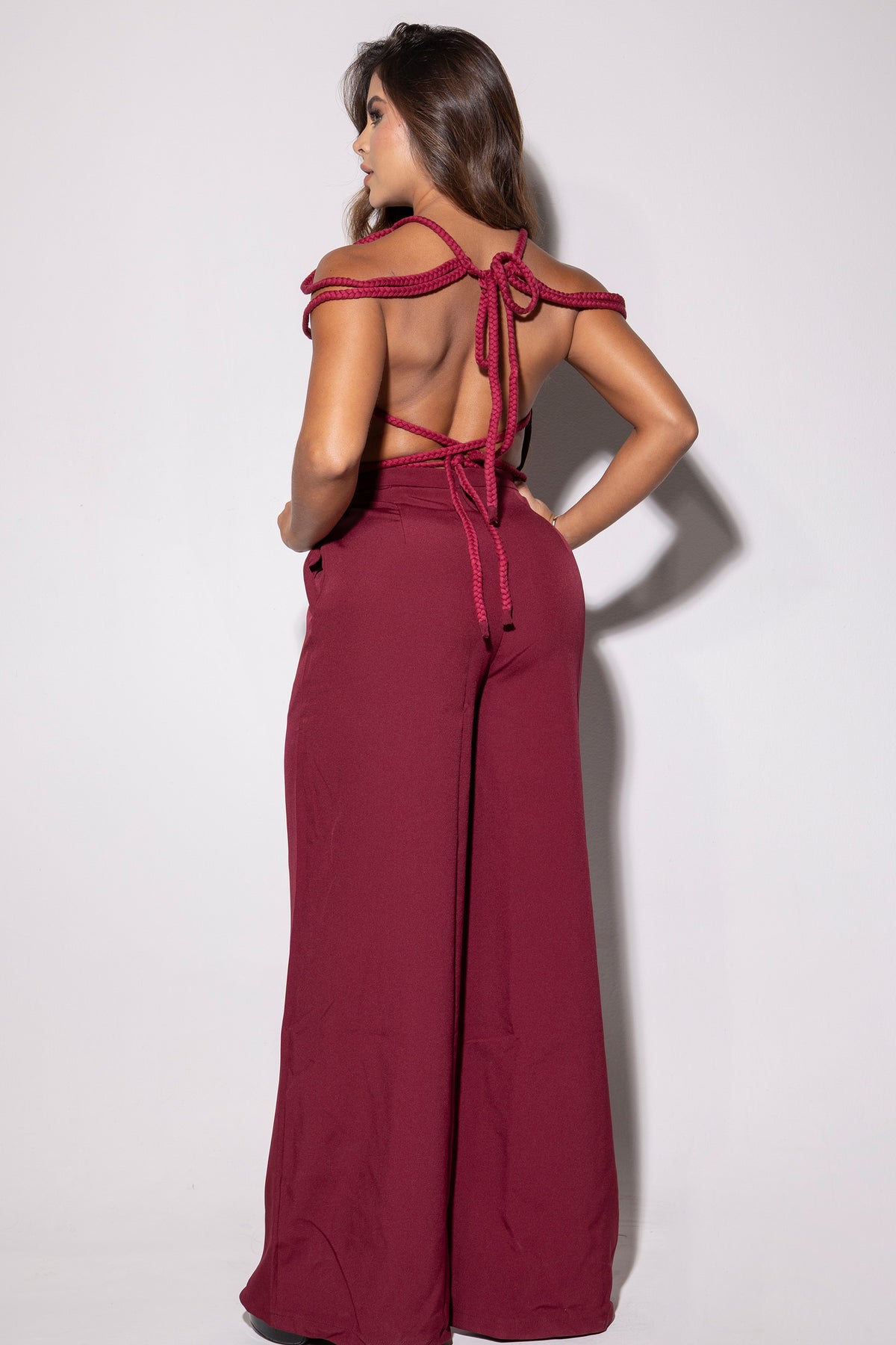 Enterizo de pantalon largo y diseños de amarres en trenza en la parte delantera y trasera con cierre en espalda