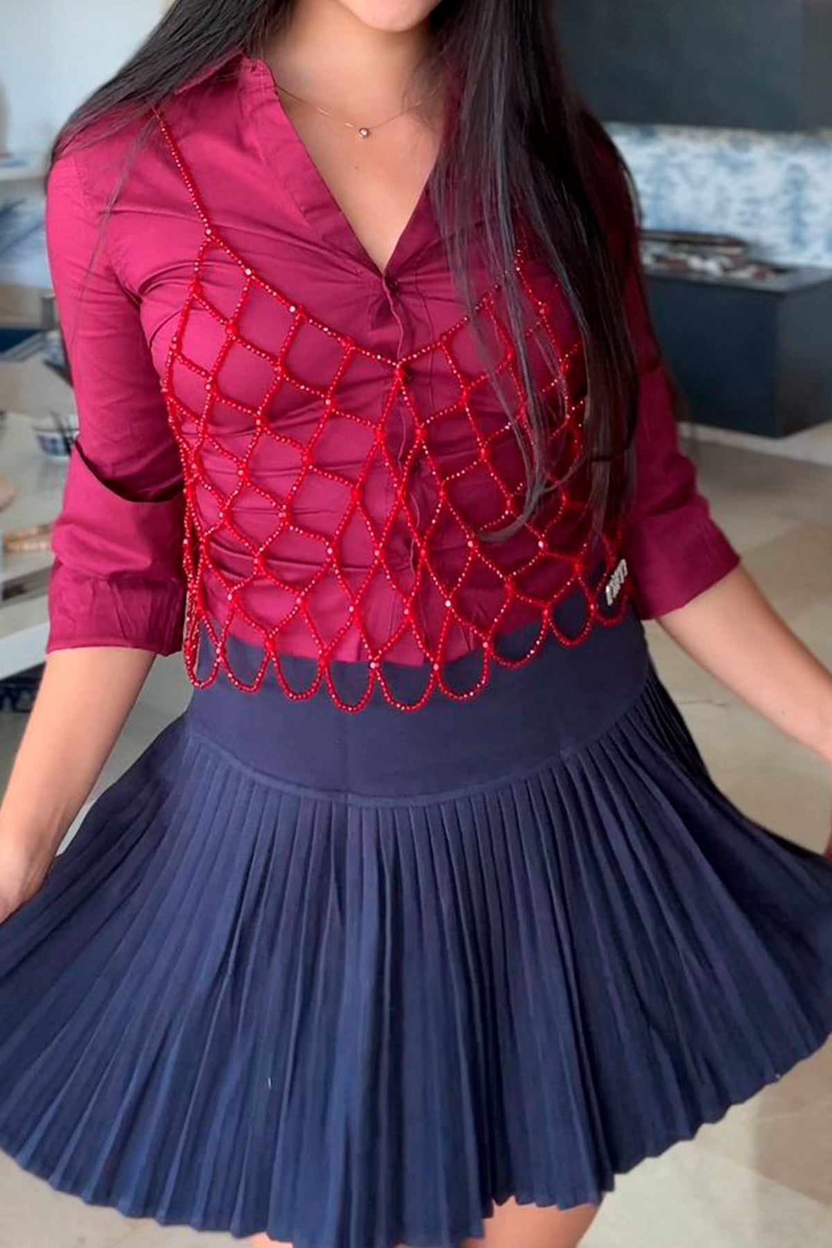 Falda en hilo con diseño de tablas y letras brillantes a un costado con fajón en pretina