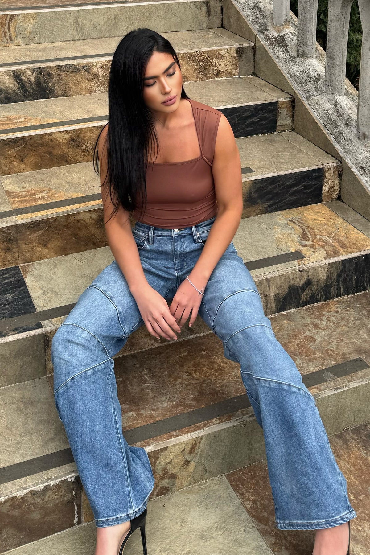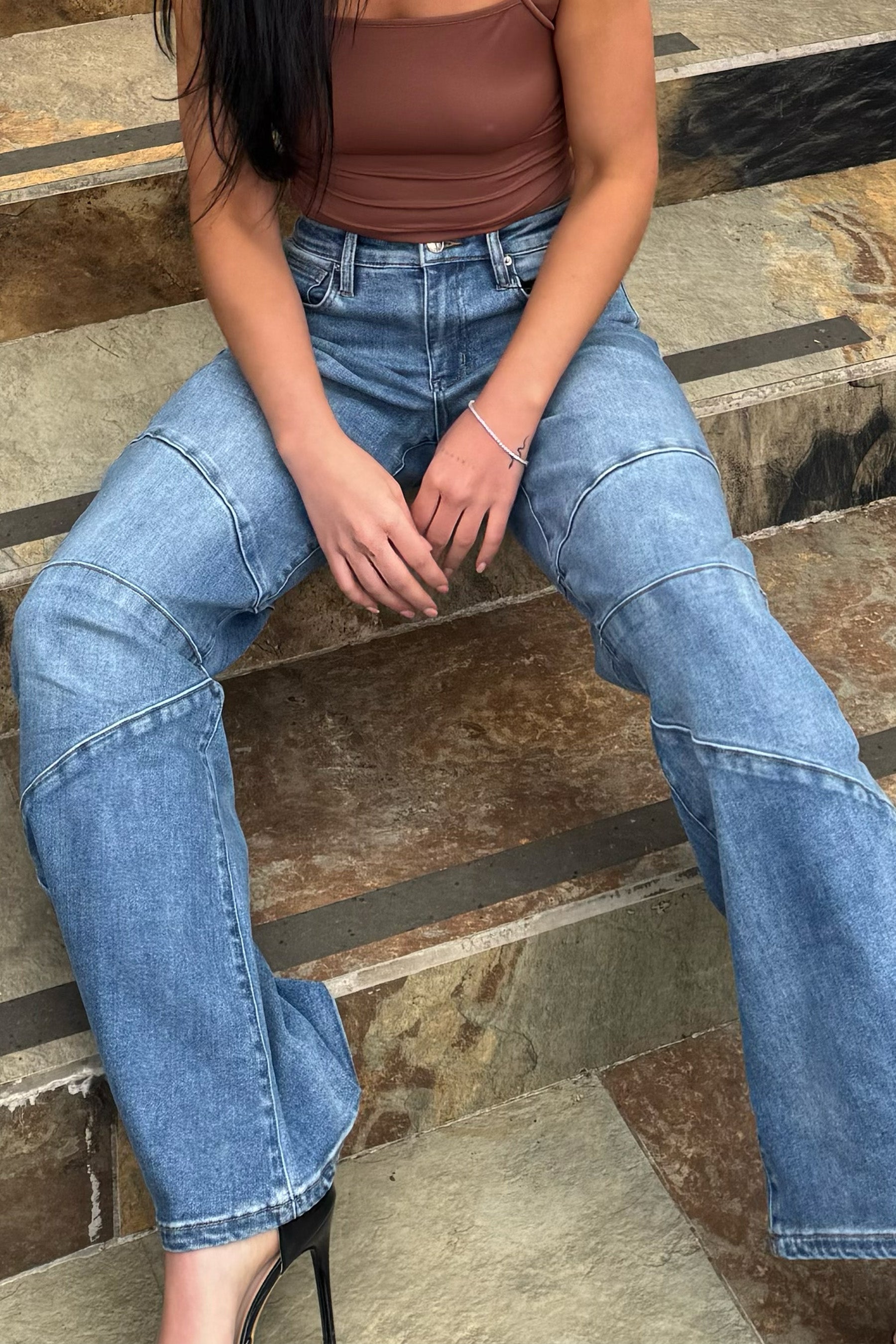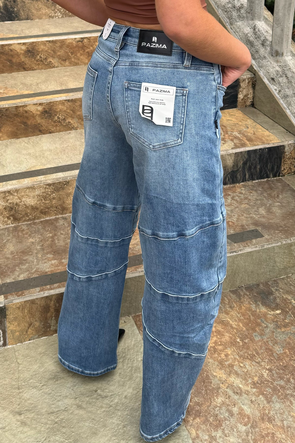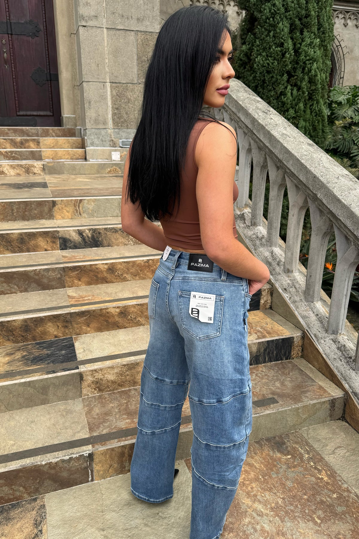 Jean en bota recta, con costuras en la parte delantera y bolsillos funcionales adelante y atrás