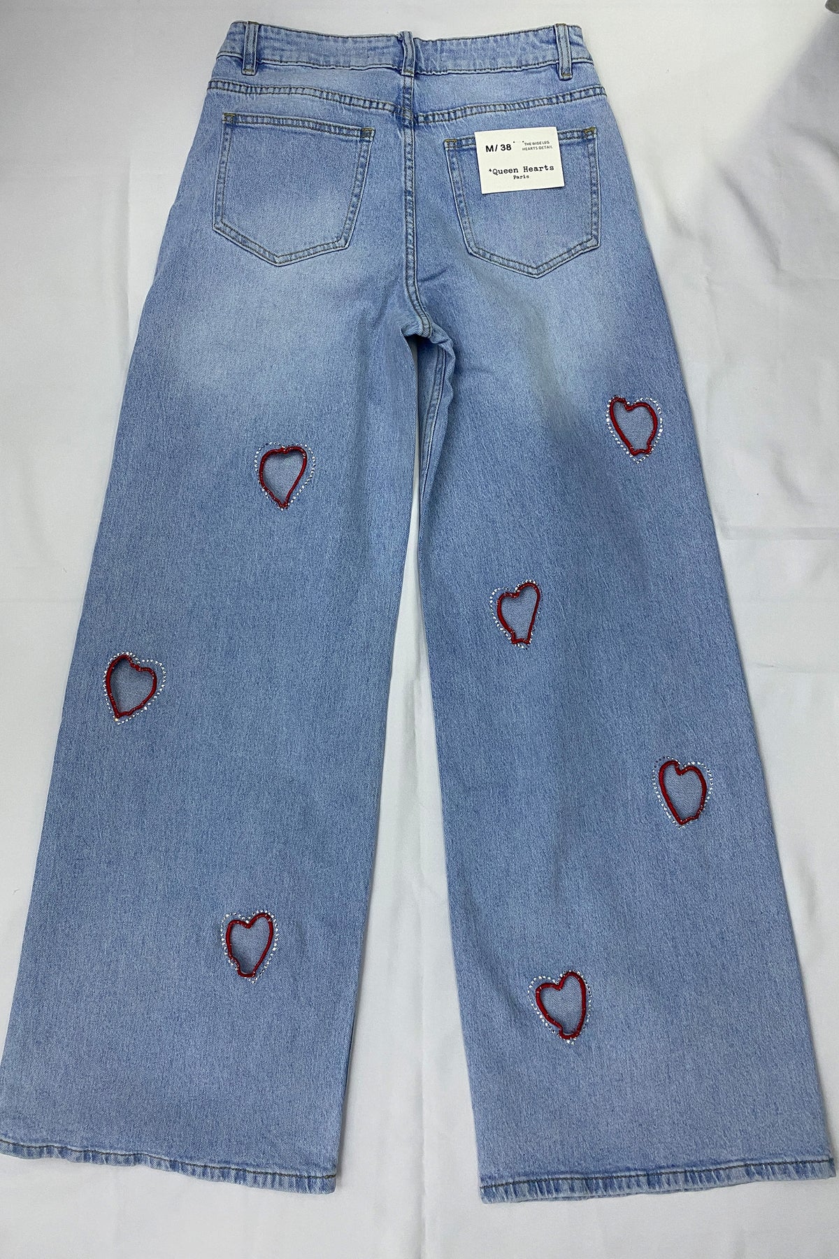 Jean con corazones en aberturas y piedras en la parte delantera, bota amplia con bolsillos funcionales