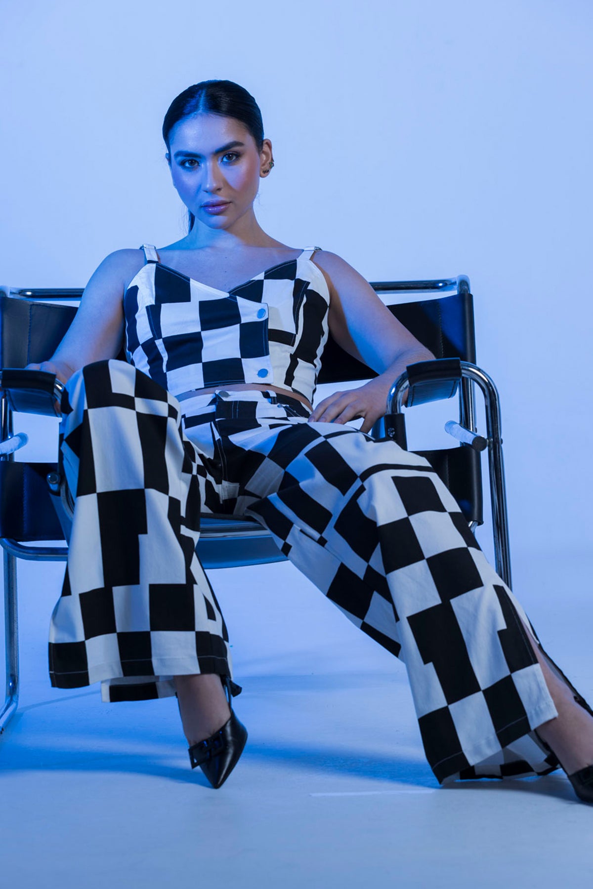 Set con diseño de ajedrez en ambas prendas de croptop con tiras ajustables y pantalon con bota recta