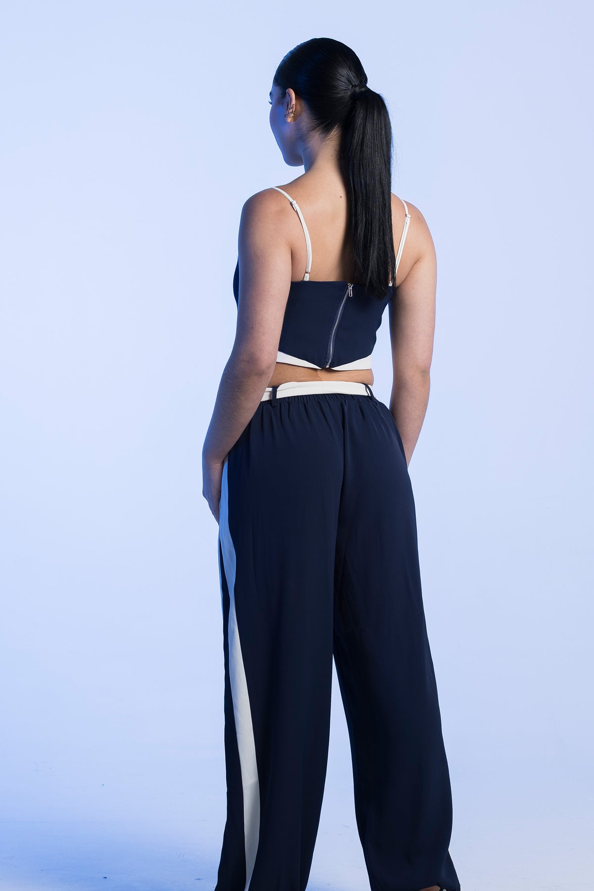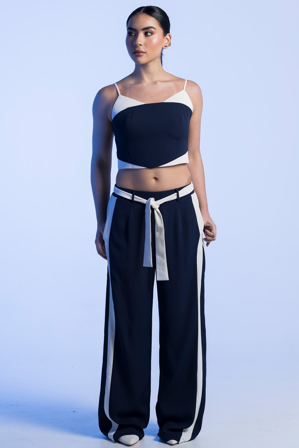 Set de croptop con tiras ajustables a dos colores y pantalon bota recta en lino