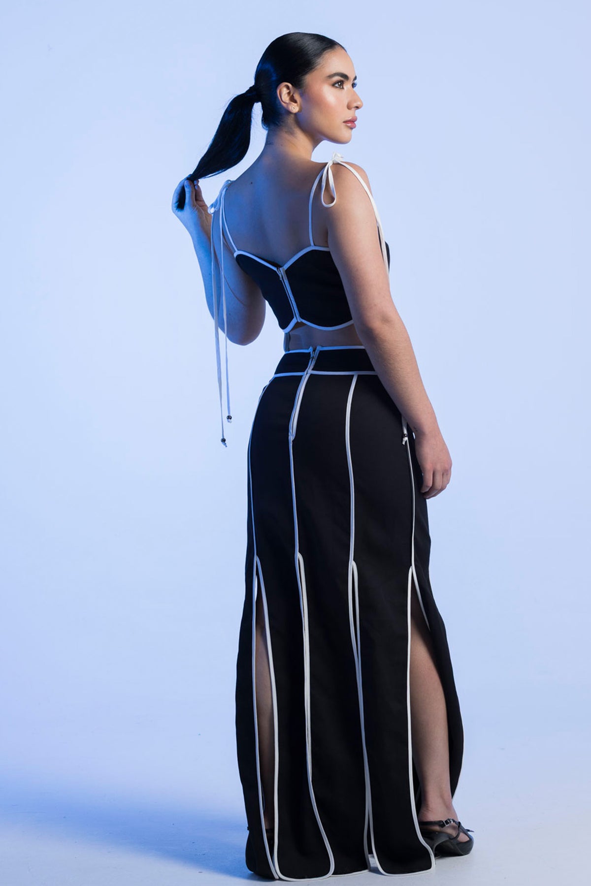 Set de croptop con cierre en espalda y amarres en la parte de los hombros y falda con cortes gruesos