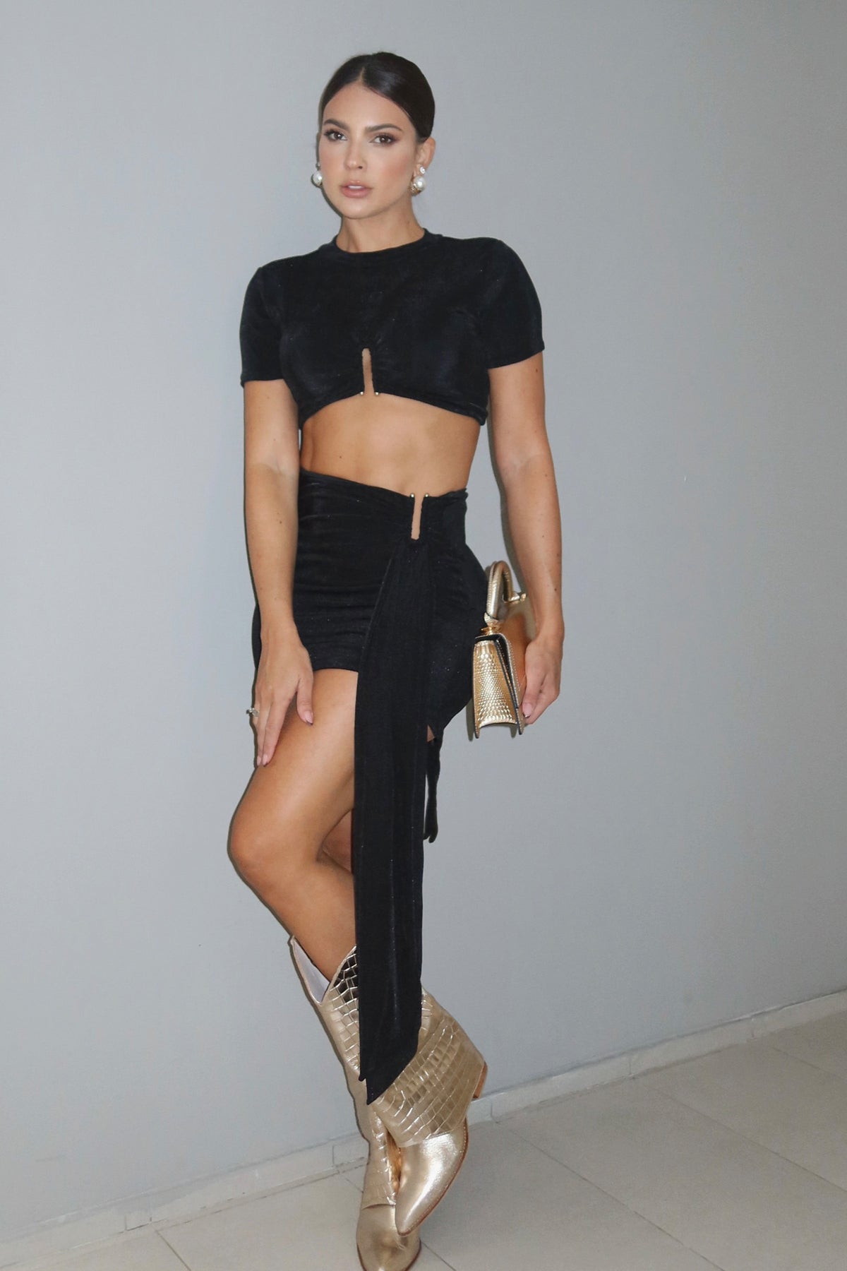 Set de falda con herraje y velo colgante con camise manga corta y herraje en la parte delantera