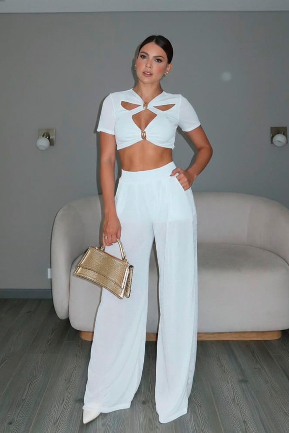 Set de pantalon largo bota amplia y camisa con broches en la parte delantera y manga corta