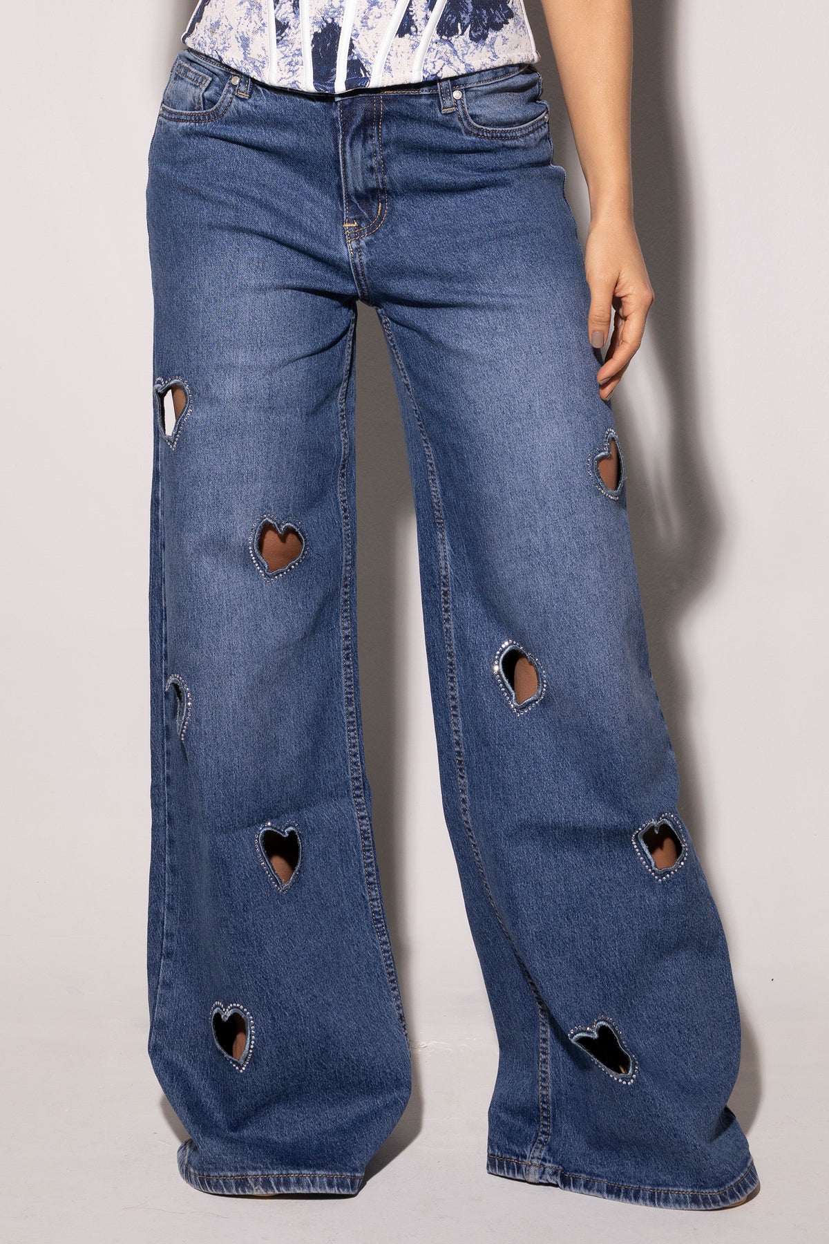 Jeans con corazon en aberturas y piedreria alrededor con bolsillos funcionales en la parte delantera y trasera