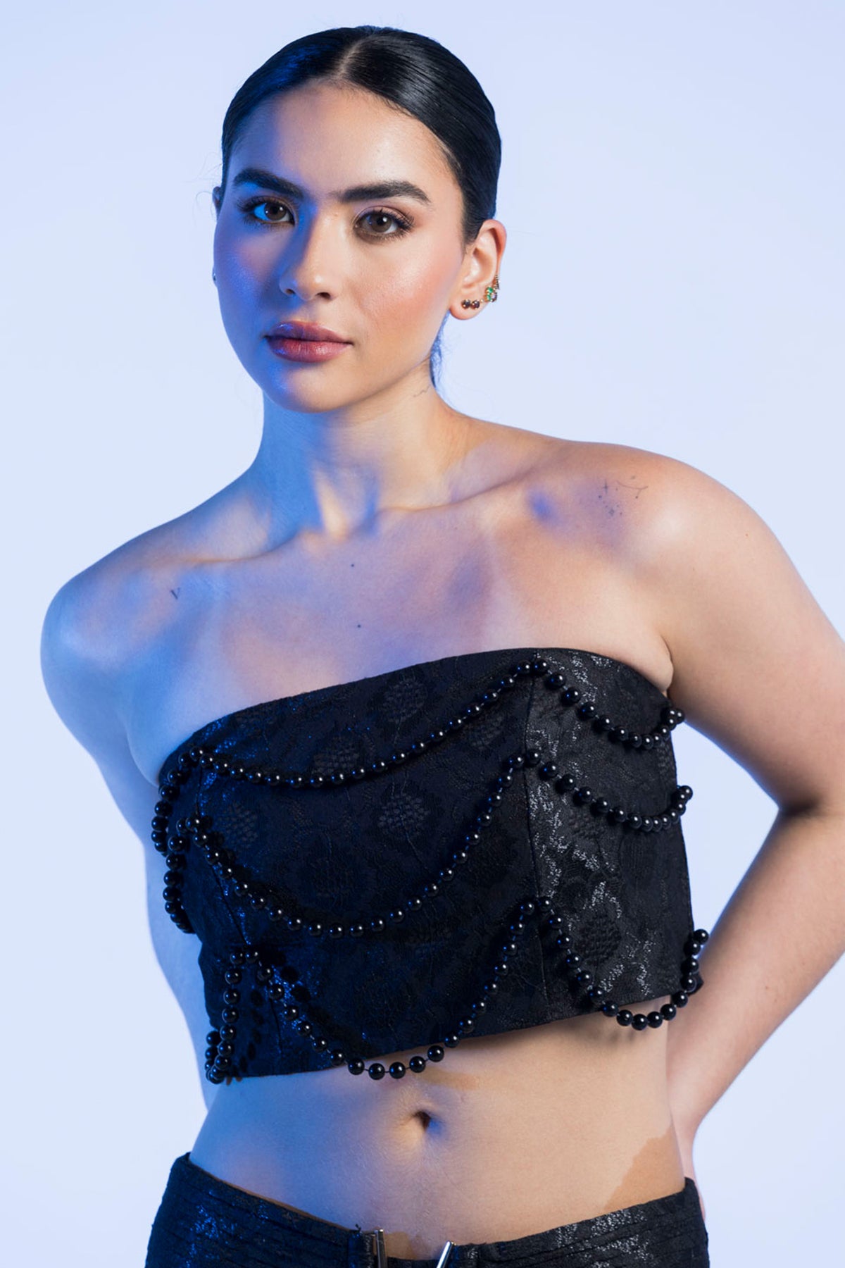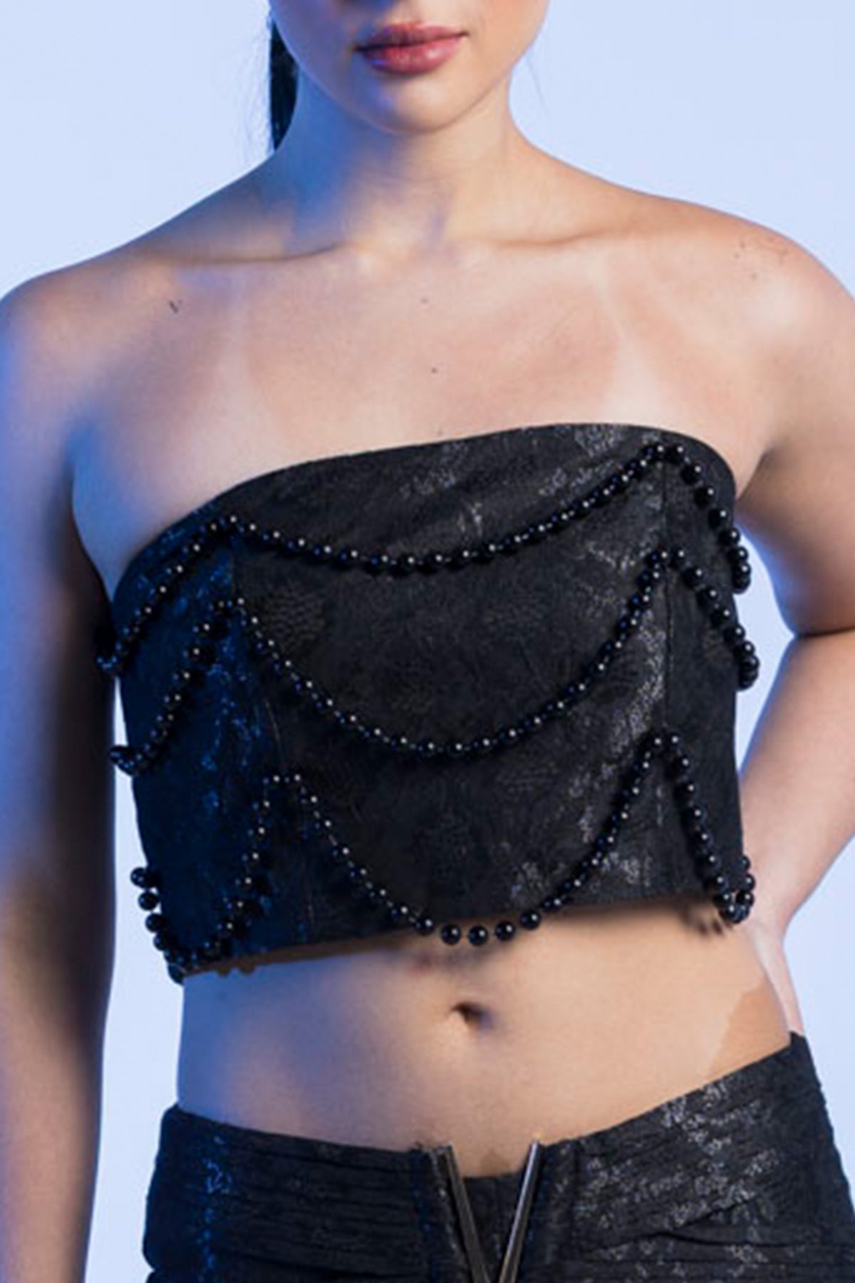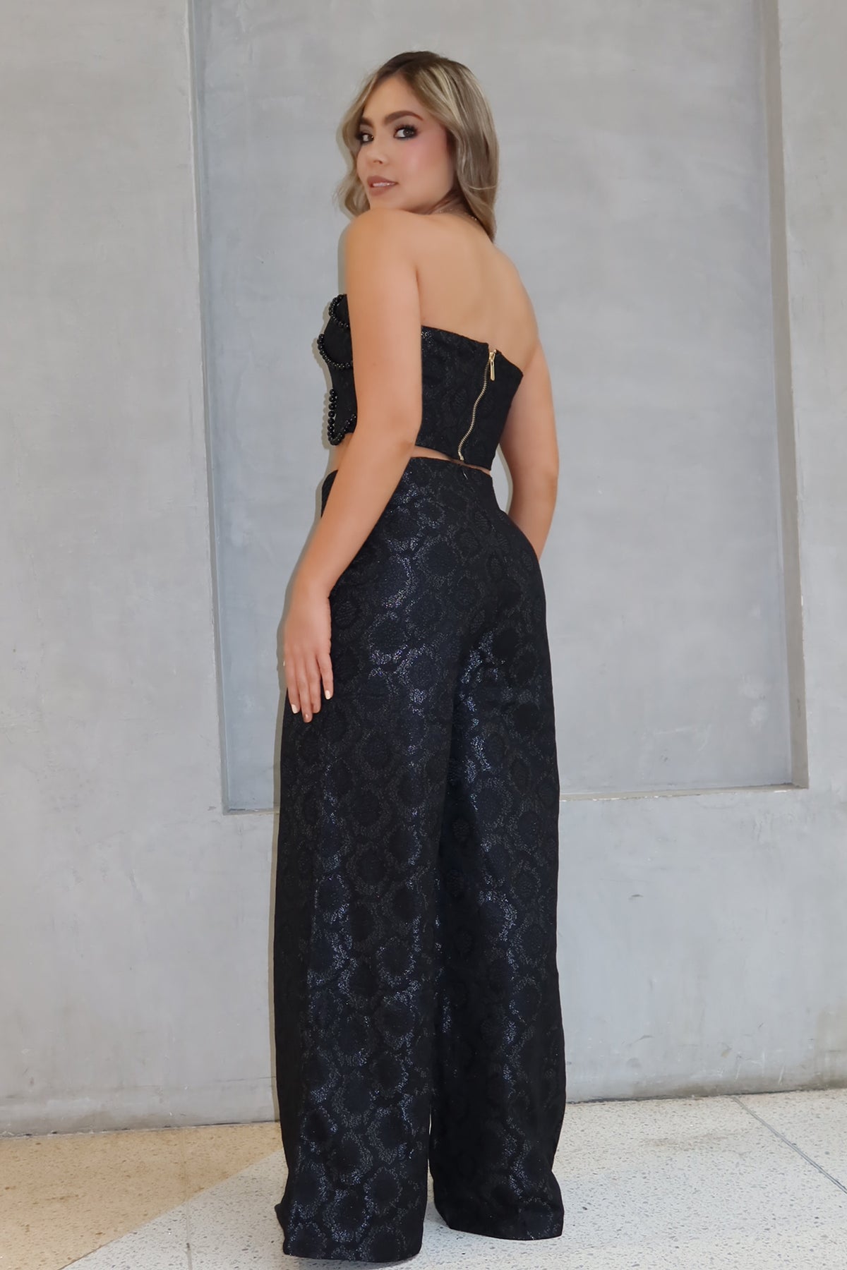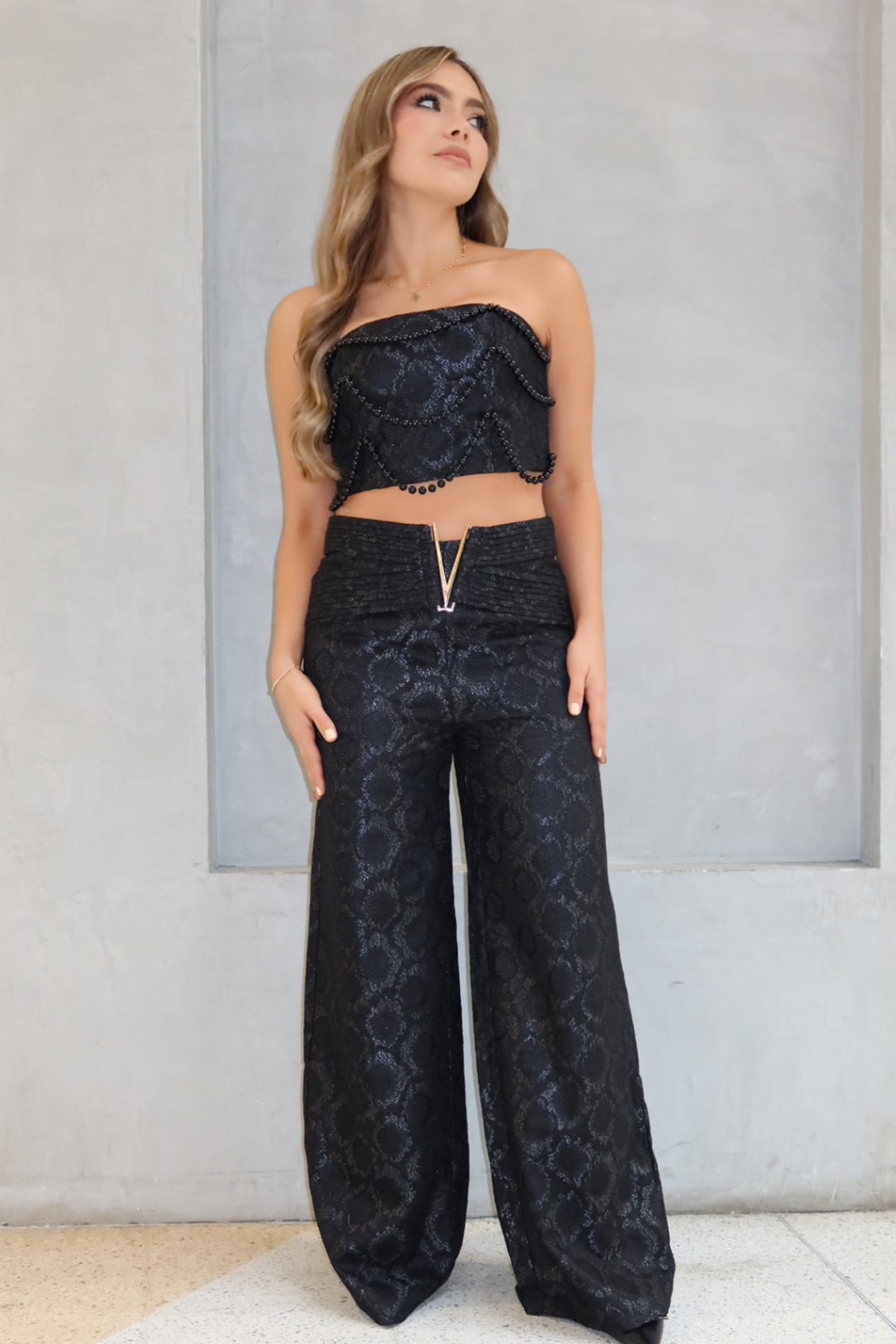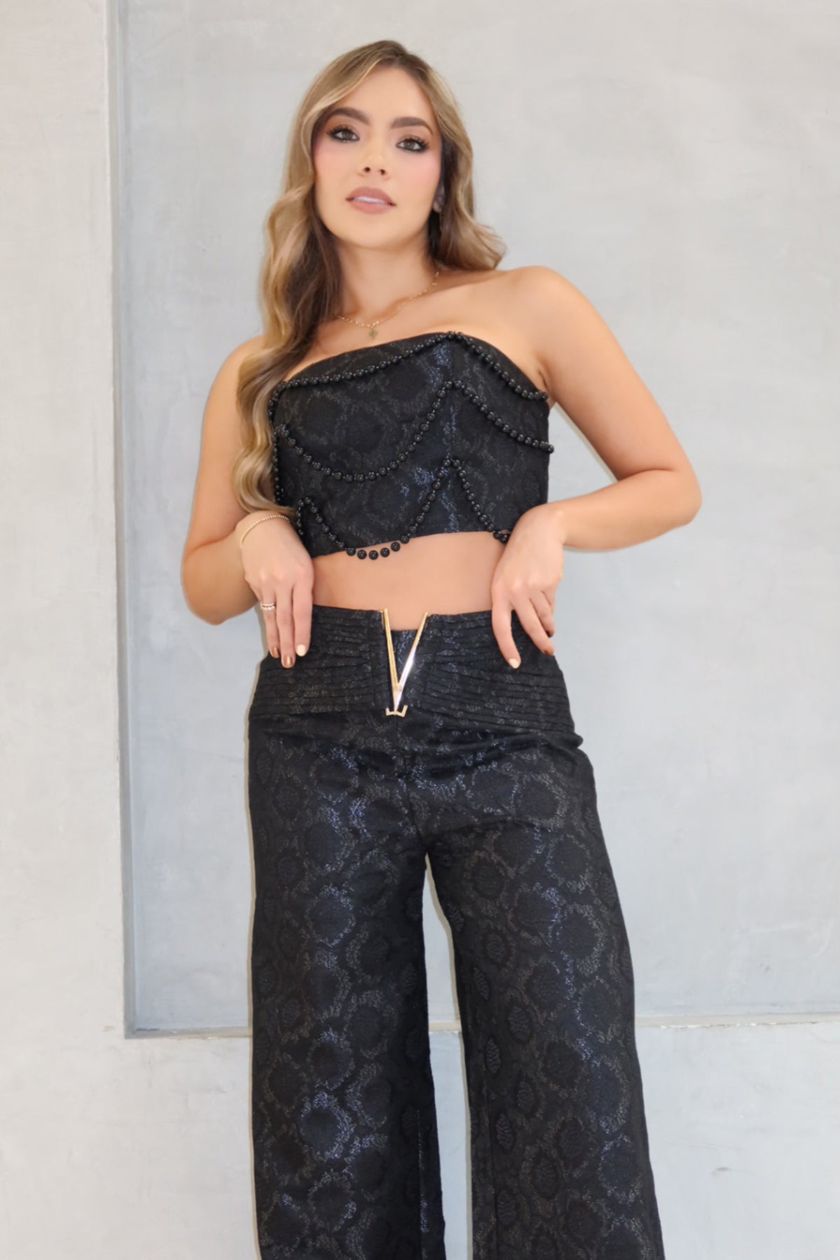 Set de croptop estraple con cadena en perlas en la parte delantera y cierre en espalda y pantalón con herraje en V y diseño en la tela con bota recta