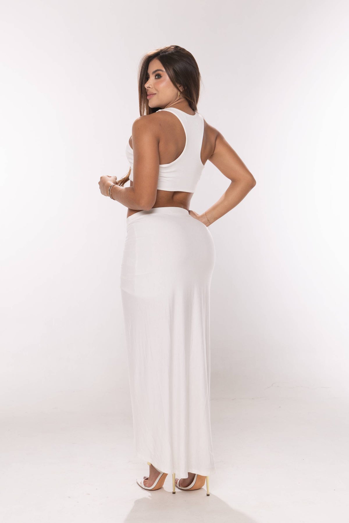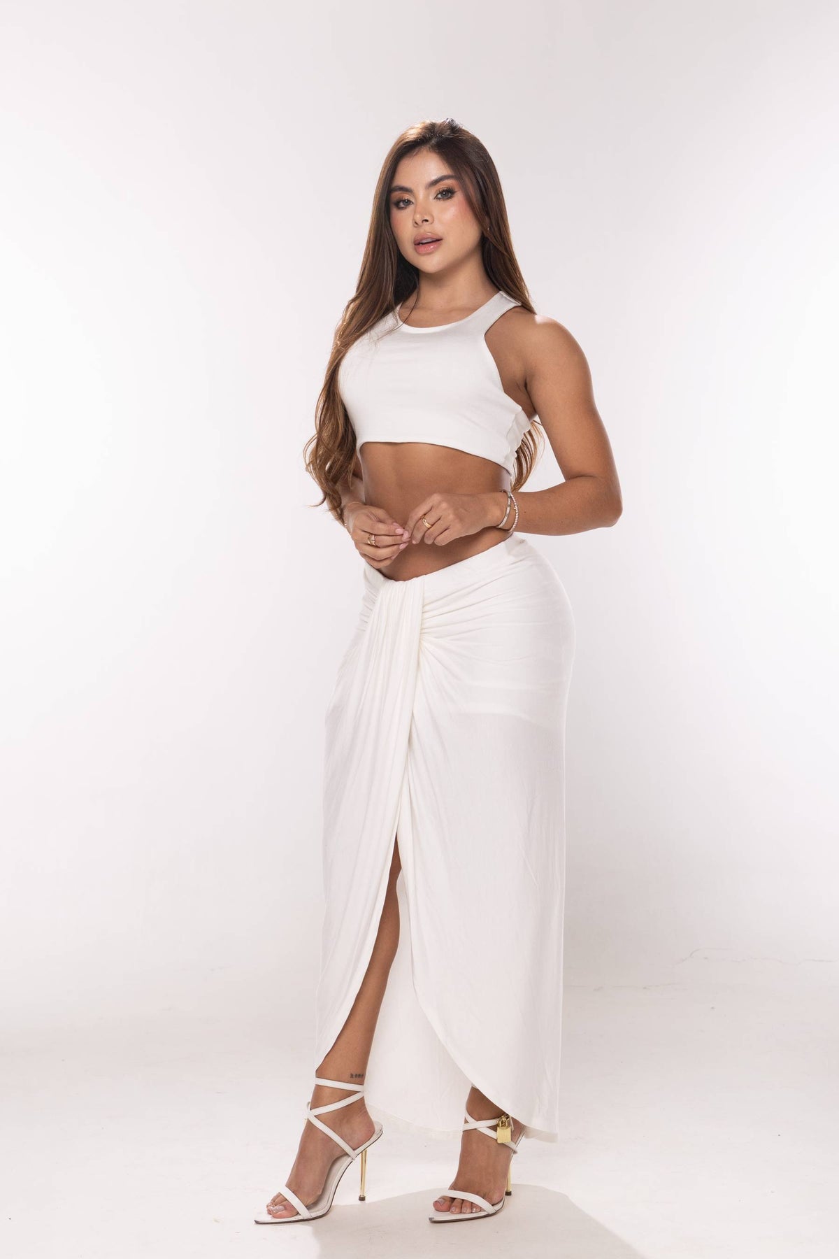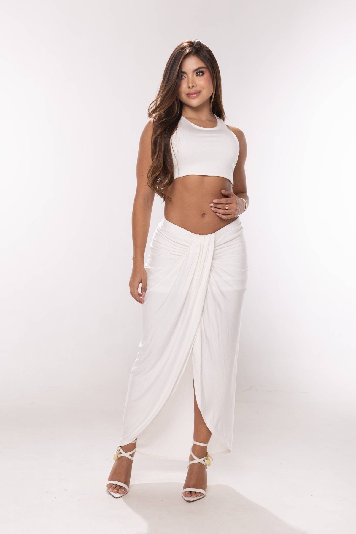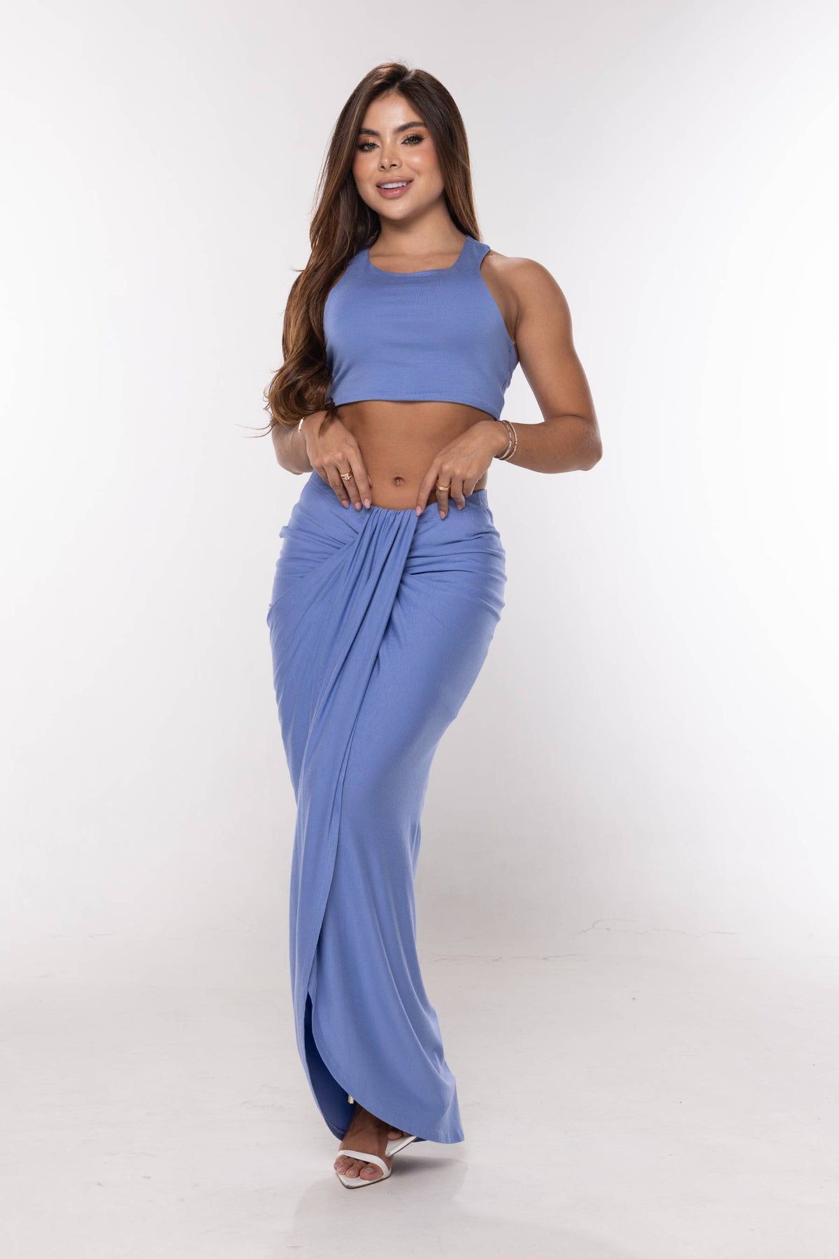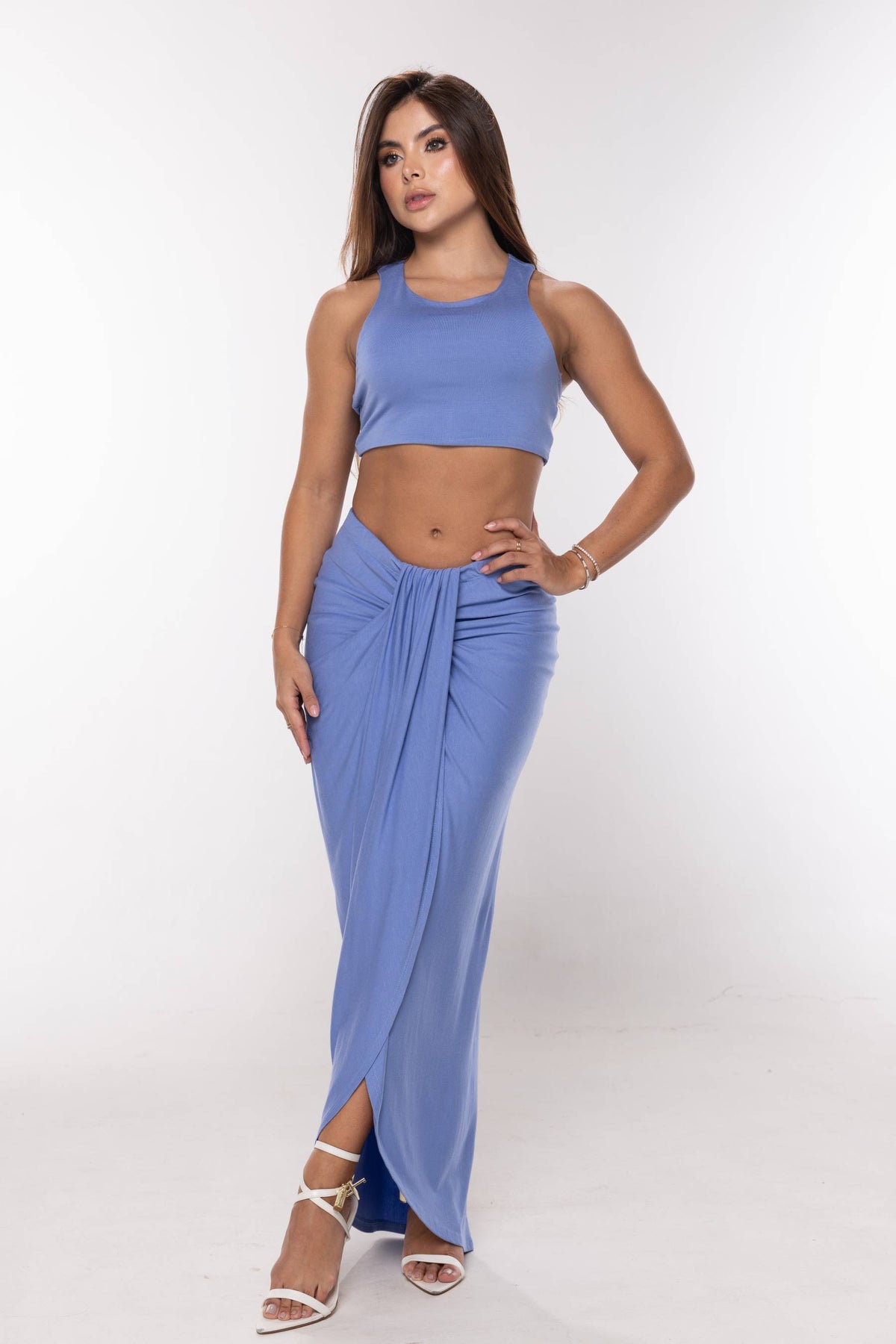 Set en tela licra de falda larga con abertura frontal y croptop manga sisa, escote redondo.