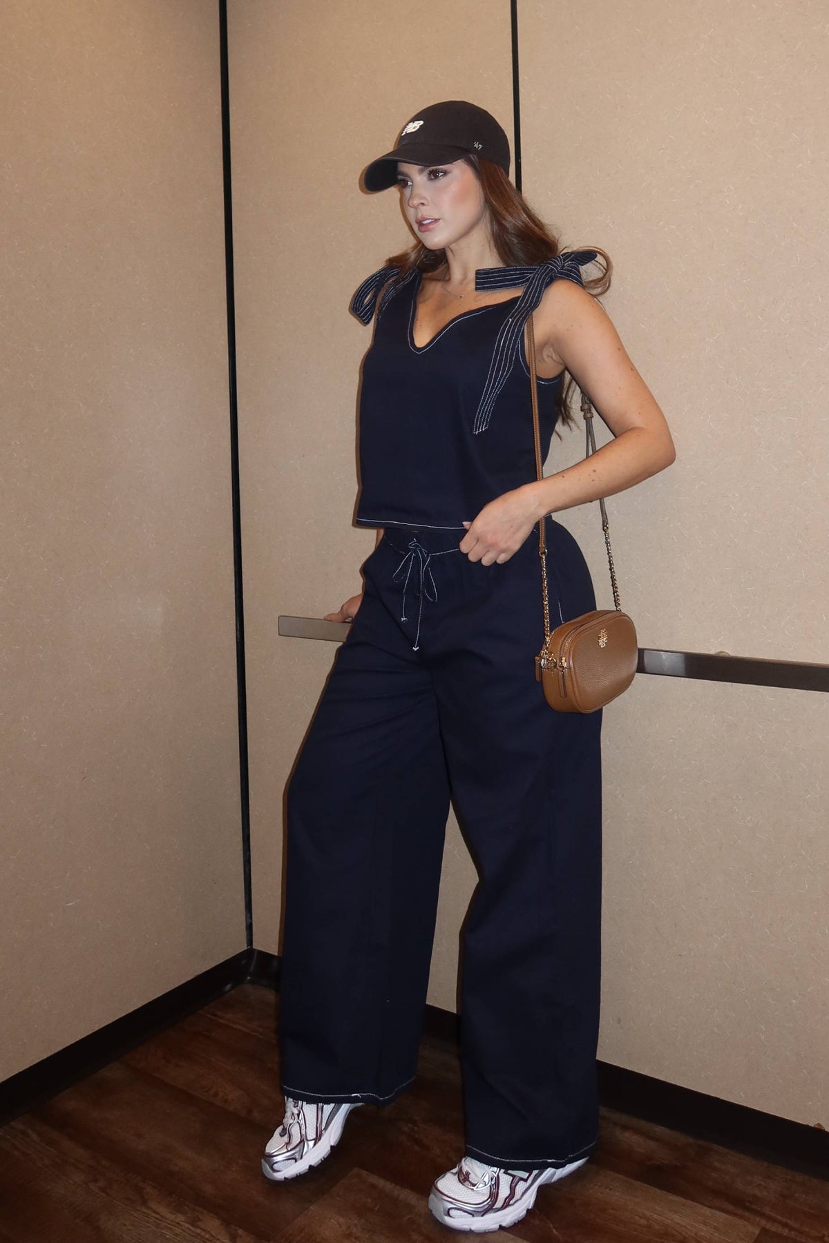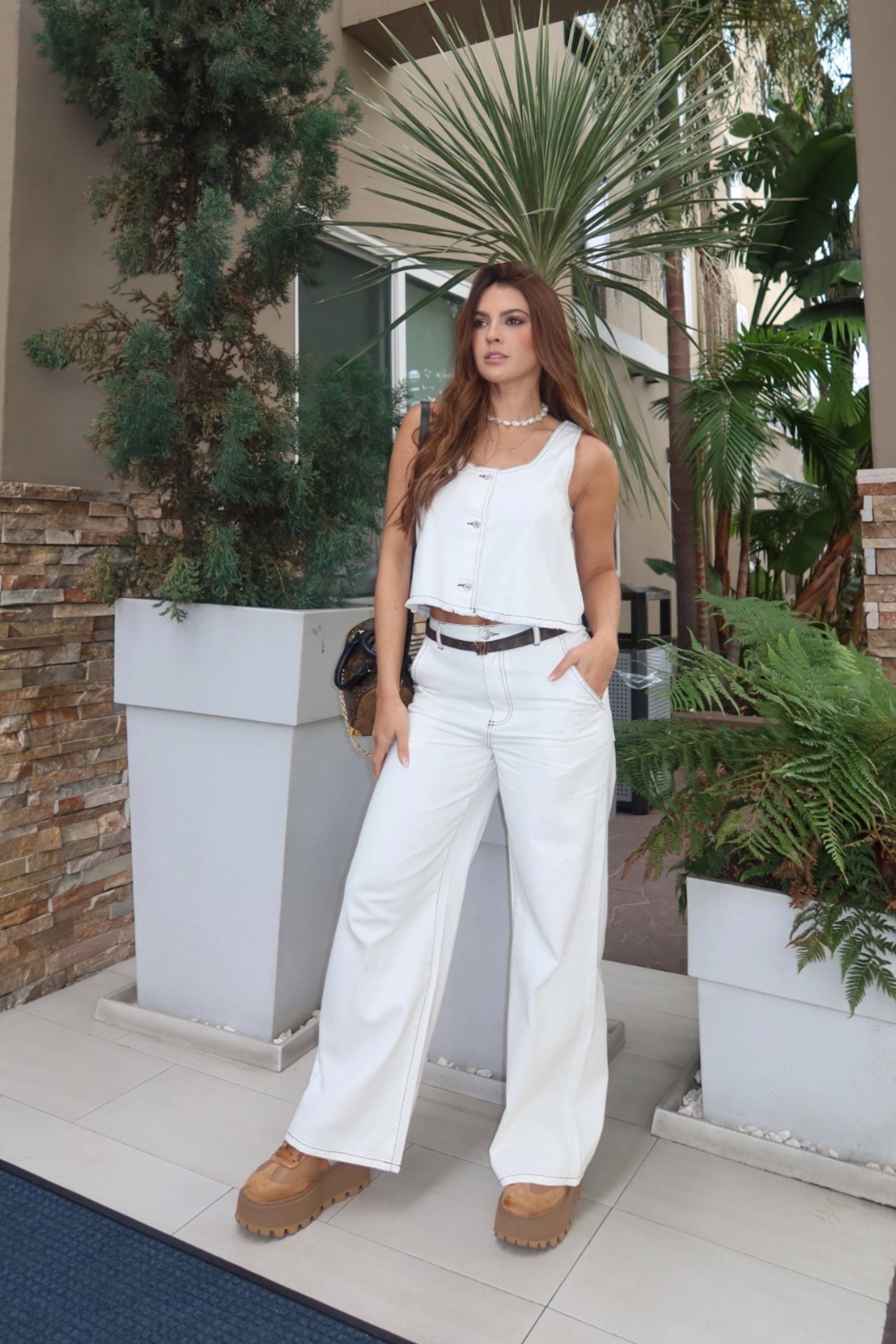 Set denim tela rigida, pantalon clasico recto con bolsillo laterales y pretina, blusa maplia con escote redondo bajo con tiras laterales.