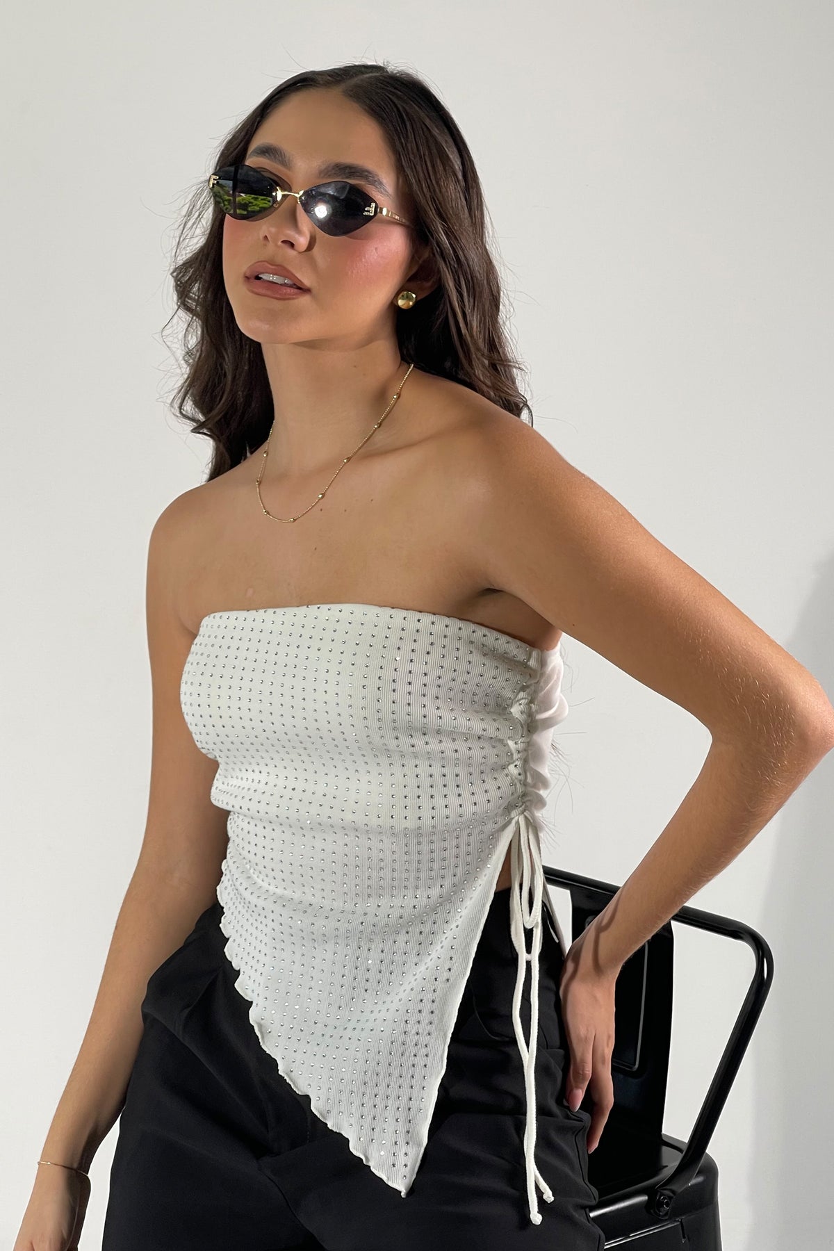 Blusa estraple con amarres a un lateral y piedreria con corte asimetrico