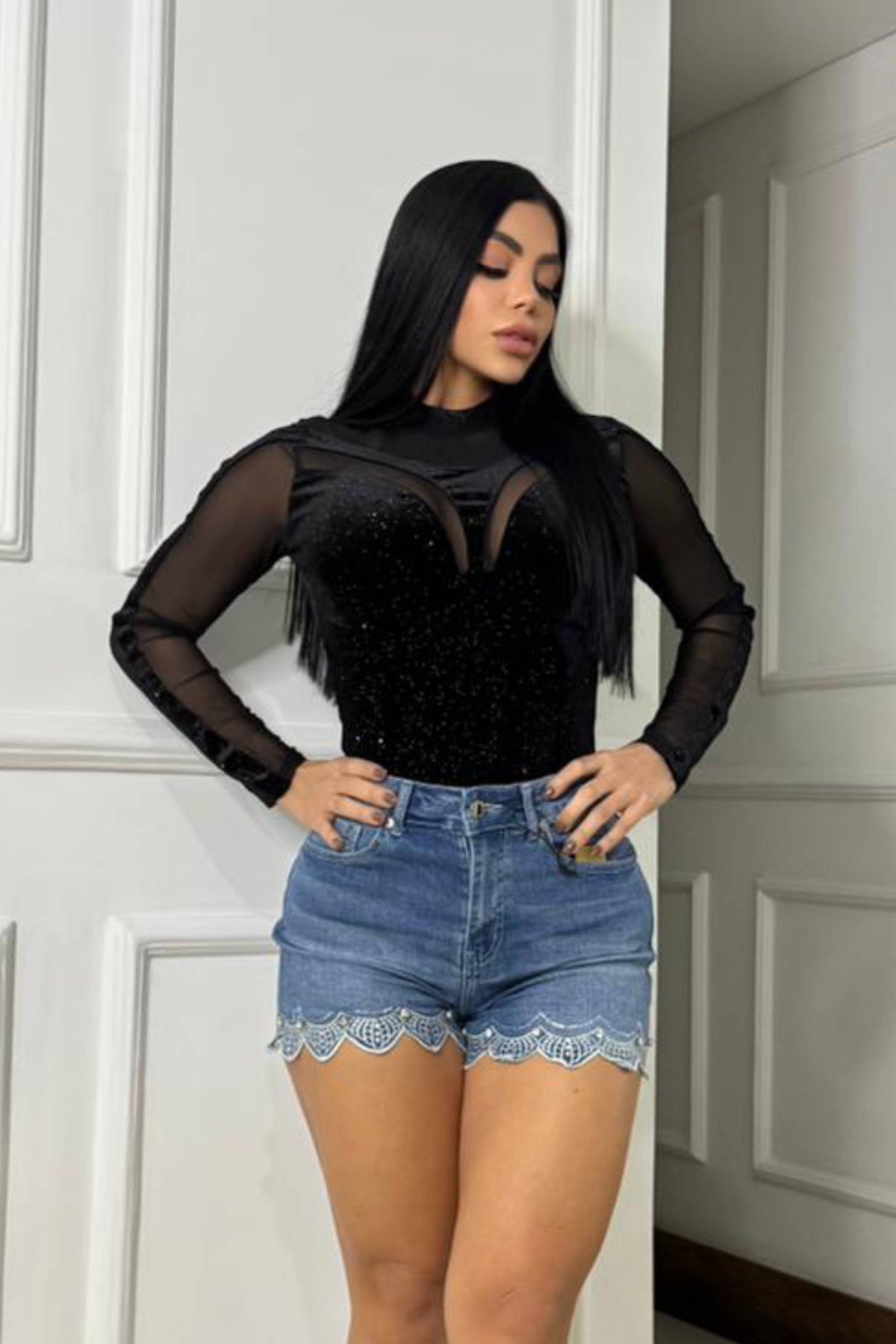 Short con cortes en ondas con tejido y piedras con bolsillos funcionales en la parte trasera y delantera