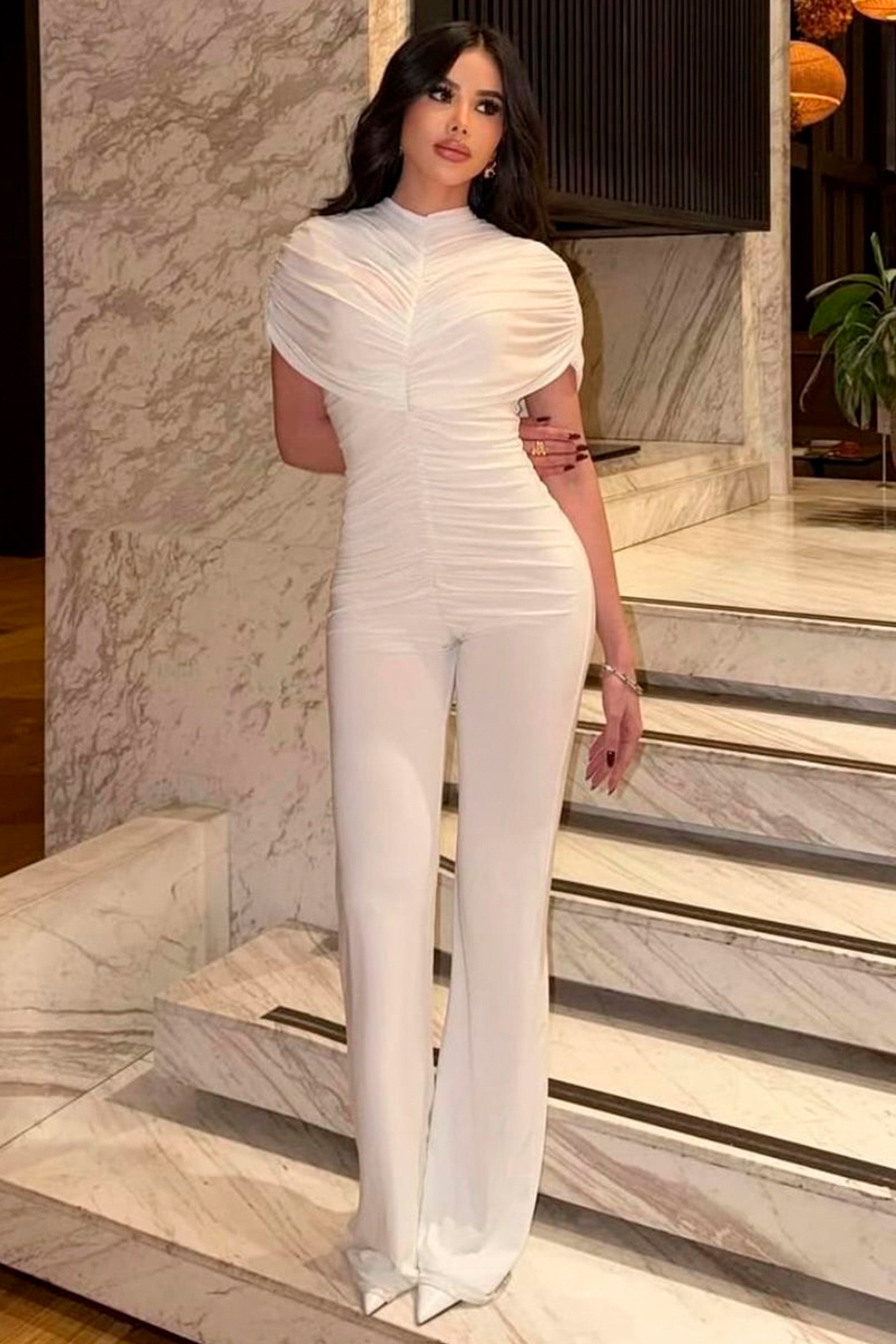 Vestido estraple con parte superior tipo corset, abertura a un lateral y falda con boleros en la parte inferior