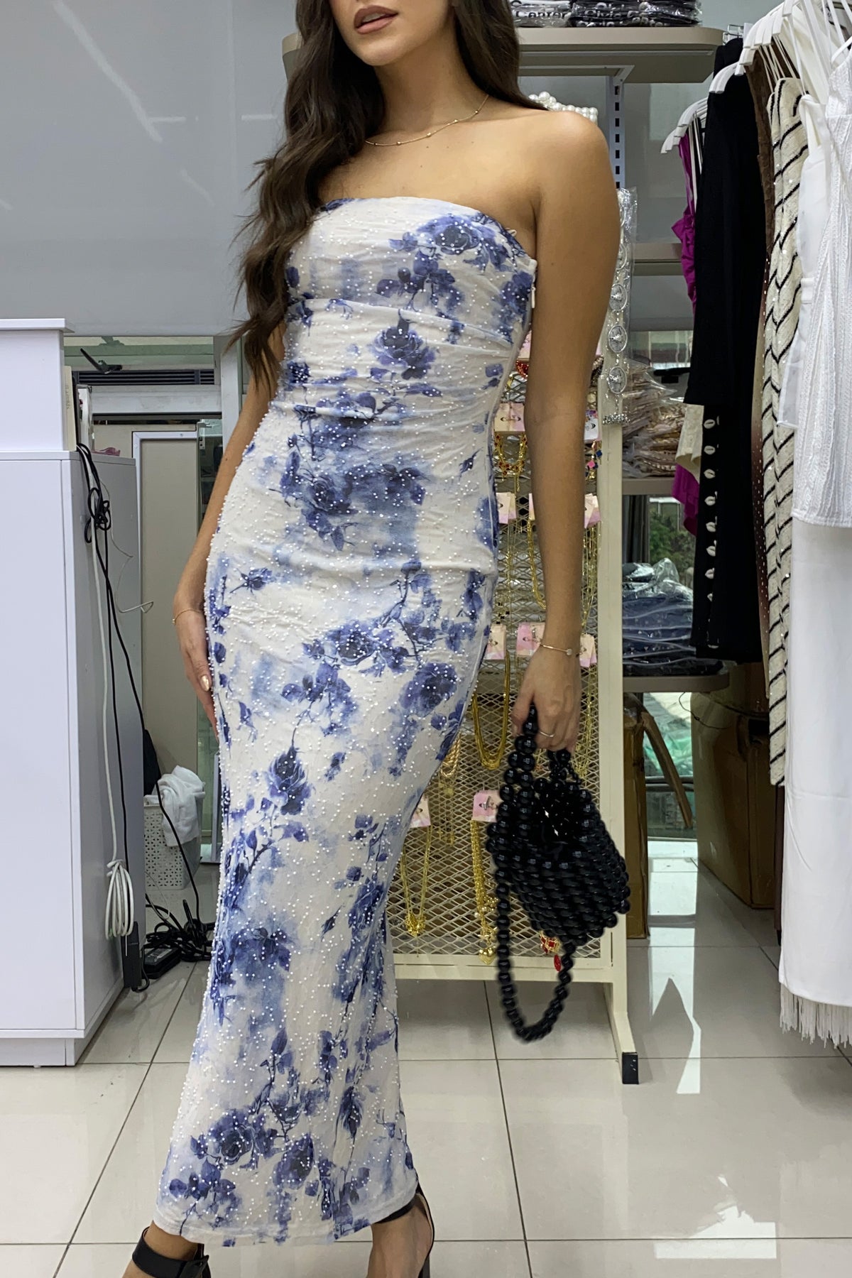 Vestido largo estraple con flores azules estampadas y pequeñas piedras brillantes en toda la prenda