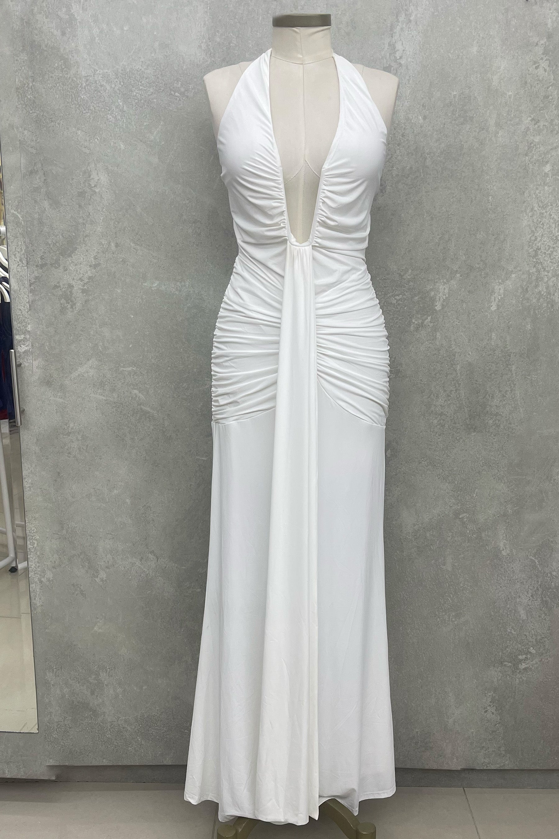 Vestido estraple largo con falda en cola de pato y parte superior drapeada con cierre en espalda