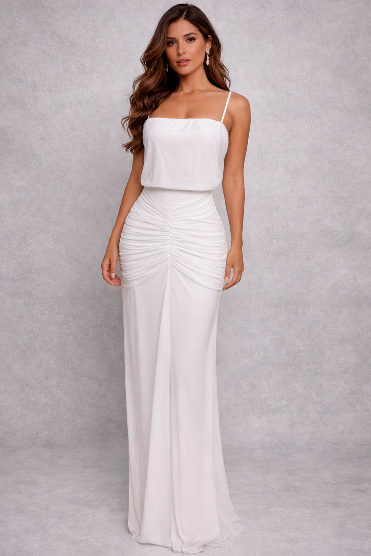 Vestido largo con falda en tela recogida y velo con caida en la parte superior con tiras ajustables en hombros