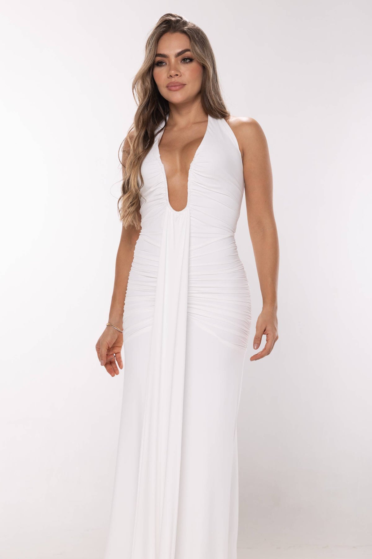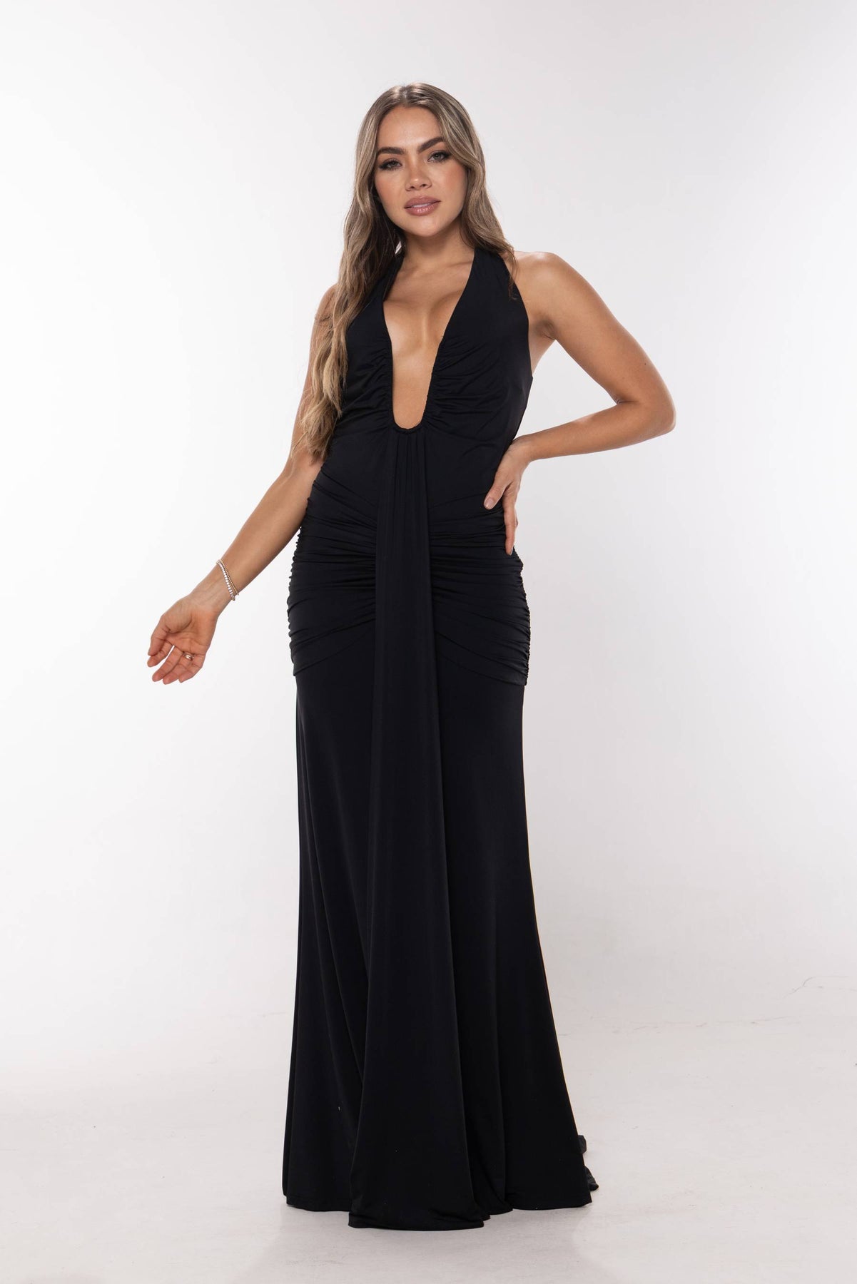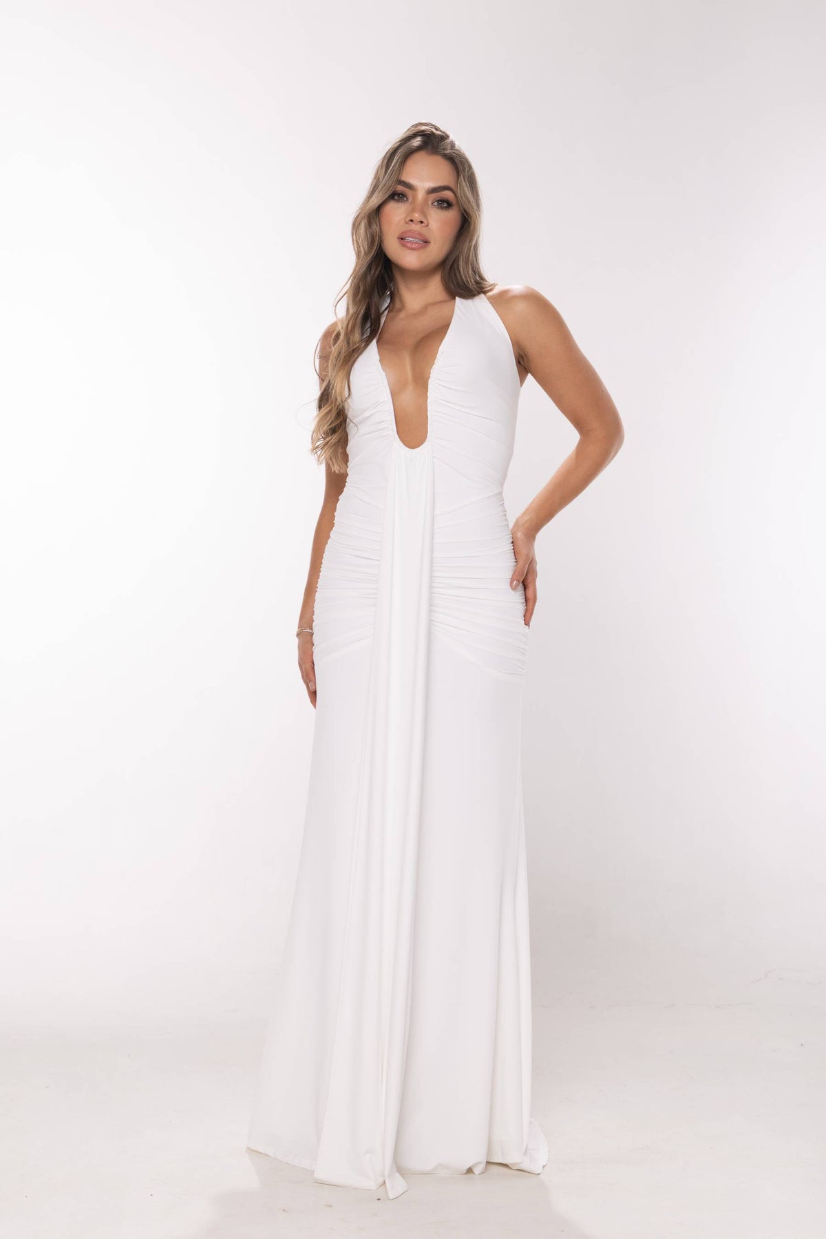 Vestido largo licrado con escote profundo , tela sobrepuesta en la parte delantera, amarres en cuello y tela recogida en cintura