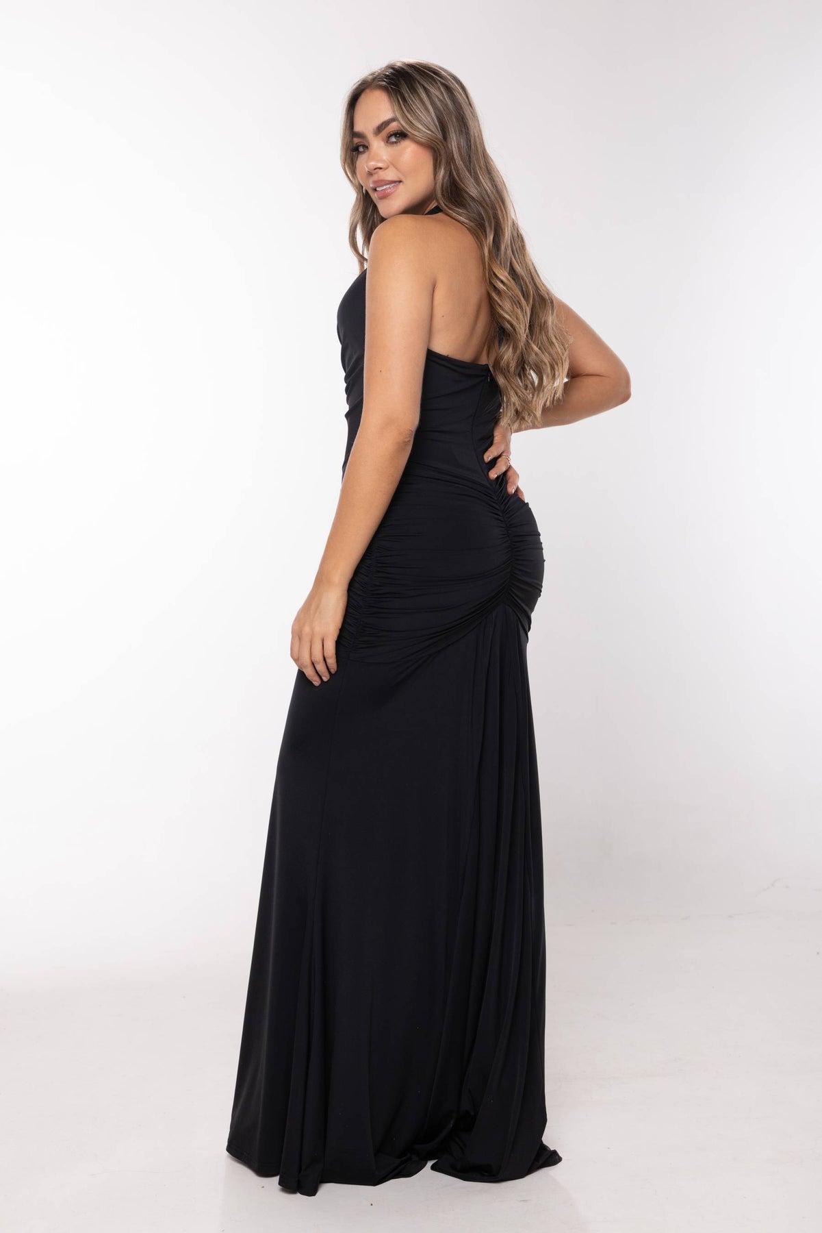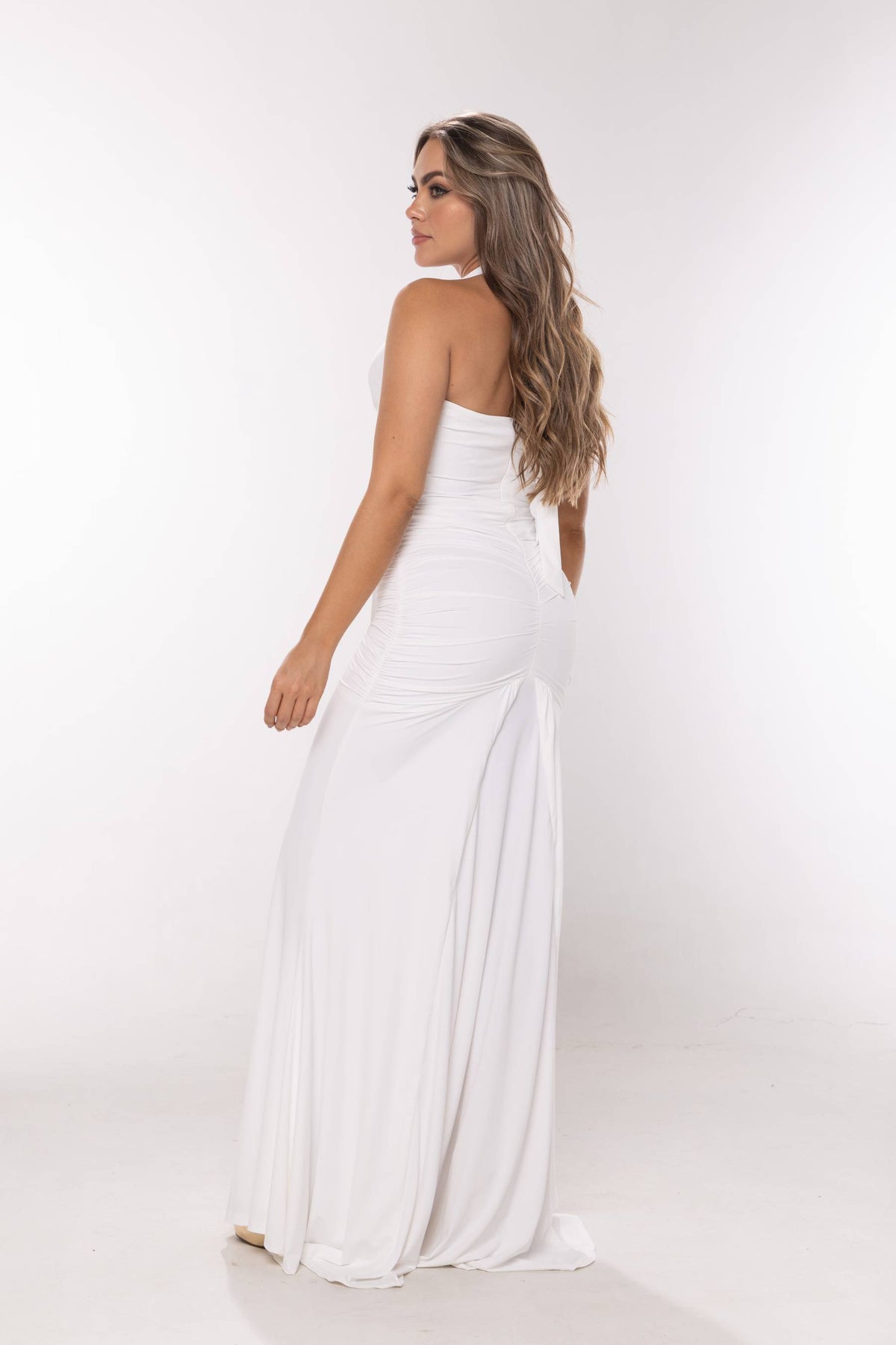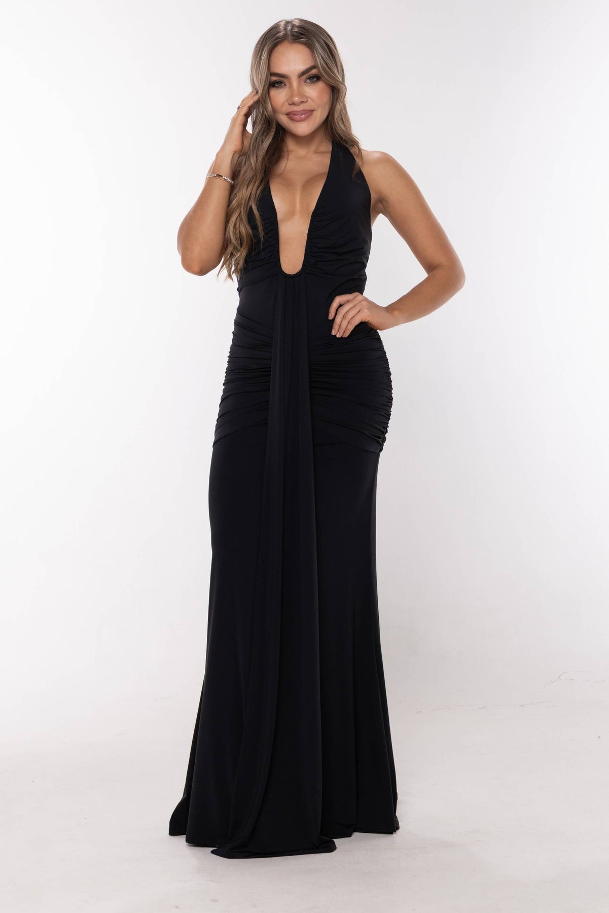 Vestido largo licrado con escote profundo , tela sobrepuesta en la parte delantera, amarres en cuello y tela recogida en cintura